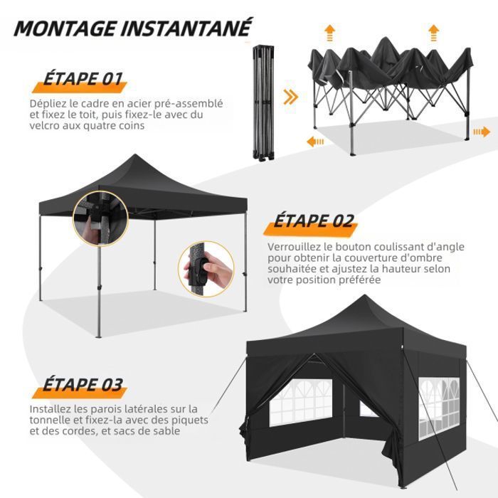 Tonnelle de jardin exterieure pliable avec moustiquaire 3.6x3.6m gris VOUNOT | Bricomarché Attention, il est préférable de démonter la tente en cas de fortes intempéries. Tonnelle Résistante Au Vent Tonnelle Pliante 3x3 Imperméable Avec 4 Parois Latérales, Installation Facile,Bleu Tonnelle Pliante Jardin Pour un montage optimal, nous conseillons la collaboration de deux personnes ou plus. Pour profiter pleinement de votre jardin ou de votre terrasse, optez pour une tonnelle pliante 3x3 imperméable. Elle vous protégera du soleil et des petites averses lors de vos repas en extérieur ou de vos moments de détente Tonnelle de jardin pliante 3x3 m - Barnum Imperméable avec 4 Côtés... 【MULTIPLES APPLICATIONS】Ce barnum pliant de 3x6 m offre un vaste espace pouvant accueillir de 15 à 20 personnes. Dotée d’un revêtement argenté, elle vous protège efficacement des rayons UV, vous permettant de profiter de moments agréables à l’ombre de votre abri. Avec une hauteur ajustable sur 3 niveaux (250/254/258 cm), il est le choix parfait pour vos fêtes, événements commerciaux et cérémonies de mariage. Pour un transport facile, un sac de rangement est inclus. 【PAROIS MODULABLES】Équipée de 2 parois zippées et 4 parois avec fenêtres, cette tonnelle de jardin vous garantit un accès facile tout en préservant votre intimité. JUMMICO Tonnelle de Jardin 3x3m, Pop up Tente Pliable avec Parois Imperméable Anti UV Respirable Hauteur Réglable avec Sac de Transport Installation Facile Bleu