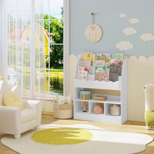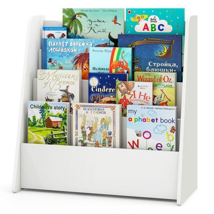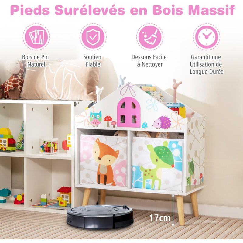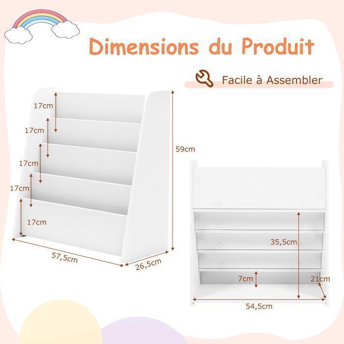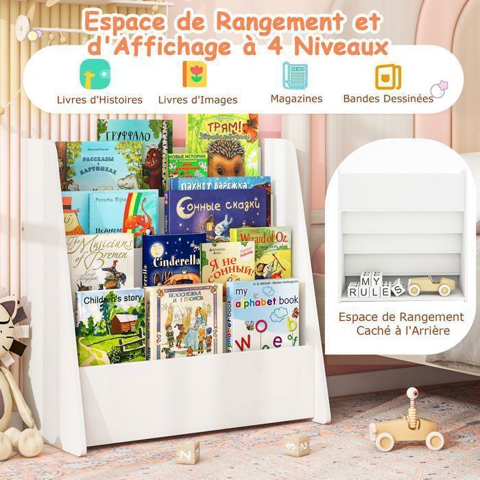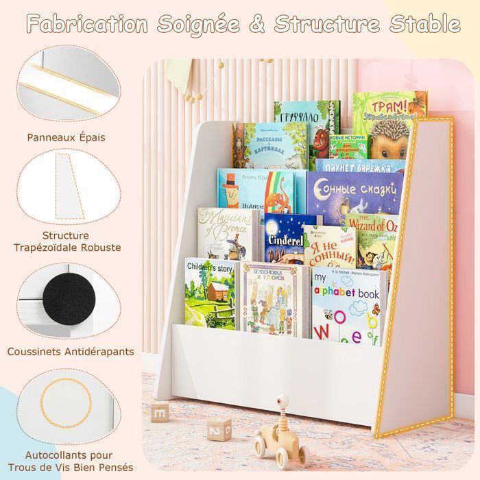 SoBuy Bibliothèque Enfant avec Tiroir, Étagère de Rangement pour Livres et Jouets, 4 Niveaux Espace d'Affichage à 4 Niveaux]La bibliothèque enfants à 4 niveaux offre un espace de rangement suffisant, permettant à votre tout-petit d'exposer ses livres d'histoires, d'images, magazines, bandes dessinées. [Conception Ouverte]La hauteur optimale de 59 cm maintient tous les livres accessibles Bibliothèque Rangement Enfant 4 Niveaux Trapèze Bibliothèque Enfant En Bois Avec 4 Compartiments Ouverts, Étagère à Livres Avec Structure Pieds Antidérapants Sécurité Elle garantit que les livres sont présentés de manière soignée et à portée de main pour les jeunes lecteurs, les aidant à rester organisés et à profiter de leurs lectures. Sa surface lisse et facile à nettoyer garantit un entretien minimal tout en assurant un environnement sûr pour les jeunes lecteurs. Bibliothèque Enfant en Bois avec 4 Compartiments Ouverts, Étagère à Livres avec Structure... [Détails raffinés pour la sécurité des enfants]- Cette étagère en bois pour enfants est conçue avec des détails dédiés à leur sécurité, tels que des bords arrondis sans éclats pour éviter les blessures. [Look accrocheur qui mettra joliment en valeur votre pièce. Elle ajoute une touche d'élégance à tout espace, que ce soit une salle de jeux, une chambre d'enfants, un jardin d'enfants ou un salon. ]- Cette étagère à livres pour enfants allie un aspect attrayant à des applications variées, ornée d'un joli grain de bois et d'autocollants décoratifs en forme de trous.