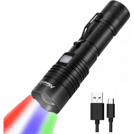 La portée lumineuse réglable vous permet d'éclairer une zone plus large ou de diriger la lumière vers une cible plus éloignée. Alonefire Couleurs Lampe - Meilleur Équipement Militaire 2026 Autonomie de la batterie : Lumière blanche : 3 heures Vert : complètement chargé Alimentée par une batterie rechargeable incluse, cette lampe torche bleue se recharge complètement en 4 à 5 heures environ. L'alimentation électrique est assurée par une batterie rechargeable fournie. 【Indicateur de charge】L'indicateur de charge vous permet de suivre l'état de charge grâce à un voyant rouge et un voyant vert, sécurisant ainsi le processus. Lampe Torche Rechargeable Usb, 2Pcs Lampe De Poche Led, 4 Modes, Anti... RGBW 4 en 1 multicolore Lumière rouge, lumière verte, lumière bleue, lumière blanche Cette lampe torche à lumière rouge dispose de quatre couleurs de lumière différentes : lumière rouge, lumière bleue, lumière verte et lumière blanche. Rechargeable via USB-C Cette lampe torche bleue dispose d'un port de chargement USB-C qui peut être branché dans le port de chargement quelle que soit l'orientation de la fiche. Contenu du paquet 1 x Lampe torche LED RGBW, 1 x Batterie rechargeable 【Coque en alliage d'aluminium de qualité】La coque de cette lampe torche verte est fabriquée en alliage d'aluminium de haute qualité, ce qui améliore considérablement la dissipation thermique et optimise sa fiabilité. Conseils : Seule la lumière rouge dispose d'un mode stroboscopique. Zoom Réglable Focalisation Torche Tactique Multicolore 4 En 1, Lumière Blanche Rouge Vert Bleu, 4 Modes Étanche Zoomable LED Pour Camping Chasse Pêche (Batterie Intégrée Mode Stroboscopique Rouge Indicateur de charge (exigences de charge : 5 V-1 A/2 A) Rouge : en cours de charge Masque Soft Light Le capuchon diffuseur fourni assure une excellente transmission de la lumière et est donc idéal pour lire et écrire à l'intérieur avec un éclairage doux. Lumière rouge : 3,5 à 4 heures 1 x Câble de chargement USB Le voyant rouge indique la charge et le voyant vert indique la charge complète. Continuez d'appuyer sur l'interrupteur pour passer de la lumière blanche à la lumière bleue, puis à la lumière verte, à la lumière rouge, à la lumière rouge clignotante, et enfin à l'extinction. Il n'y a pas de fonction permettant d'enregistrer le dernier réglage. Il peut également être utilisé pour l'éclairage extérieur, les bâtons lumineux et autres applications similaires. 1 x Masque Soft Light Mise au point réglable Le zoom vous permet de modifier le faisceau lumineux, passant d'un faisceau concentré à un faisceau large. Conseils : si la batterie de la lampe torche est trop faible (la lumière est faible), il est recommandé de la recharger à temps afin d'éviter tout dommage causé à la batterie par une décharge excessive. Torche Publicitaire rechargeable écologique Gear X - Cadoétik Elle s'insère dans le port de charge indépendamment de l'avant et de l'arrière de la prise, ce qui facilite et simplifie le chargement.