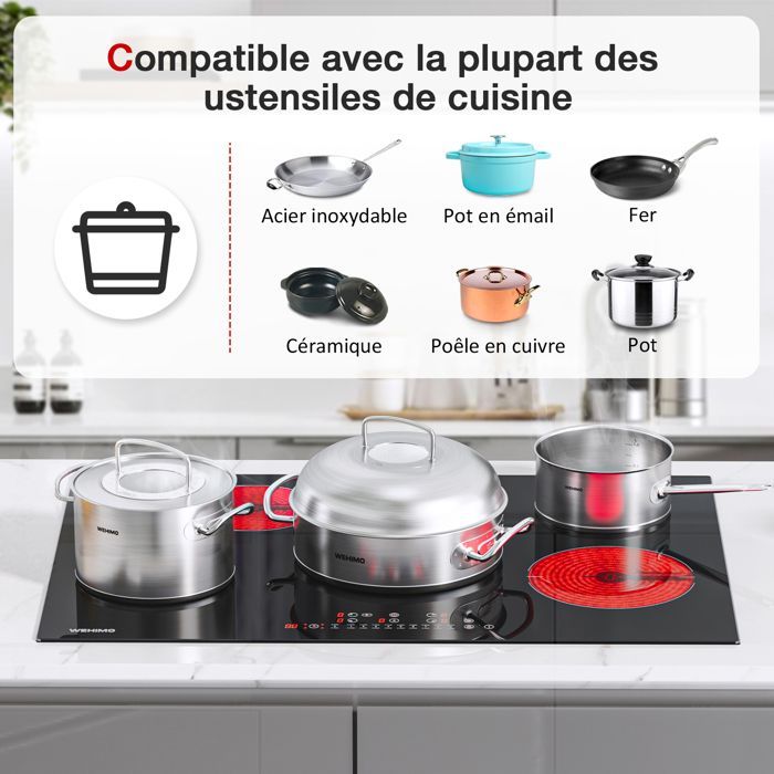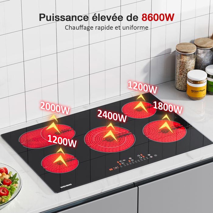 Grâce à la commande tactile, vous pouvez régler la puissance avec précision. Test de la plaque vitrocéramique AMZCHEF : performance 5 feux et La zone de cuisson peut être éteinte automatiquement après un temps prédéfini. Plaque Cuisson 77cm 8500W Zones Triple Ovale Encastrable Plaque Vitrocéramique 4 Feux, Hobsir Vitrocéramique Avec Cadre, Encastrable 77Cm, 6800W, 9 Plaque Cuisson Electrique 【9 Niveaux de Puissance】Chaque plaque cuisson electrique dispose de 9 niveaux de chauffage. Que ce soit pour cuire, mijoter, rôtir ou frire, les 9 niveaux réglables couvrent tous les types de cuisson. Whirlpool Plaque Electrique 77cm FlexiCook 4 Zones à induction NOIR... ce qui la rend beaucoup plus polyvalente et flexible qu'une plaque à induction. La table de cuisson vitrocéramique doit être câblée et ne dispose pas de prise. Vous rêvez d'une cuisine équipée pour régaler toute la famille ? La plaque vitrocéramique 5 feux vous offre la flexibilité nécessaire pour préparer des plats élaborés et gérer plusieurs cuissons simultanément L'installation encastrée permet de garder l'espace de travail propre et bien rangé. La table de cuisson vitrocéramique encastrable vous permet de gagner un espace précieux dans votre cuisine. Le plaque vitrocéramique dispose également d'une fonction minuterie de 99 minutes qui facilite la cuisson et vous laisse les mains libres. La triple zone (700W/1500W/2300W) pour les casseroles de différentes tailles et les zones ovales (900W/2000W) permettent d'utiliser des casseroles ovales ou rectangulaires afin de répondre à différents besoins de cuisson simultanément. Toutes ces fonctions peuvent prévenir les accidents et garantir la sécurité de toute la famille.