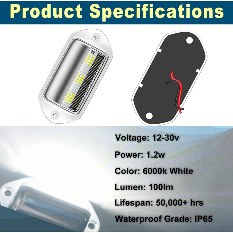 Achetez Yinaolan 1 feux Lampes de plaque d'immatriculation LED 12V/24V étanches 6 SMD pour voiture, remorque, camion, caravane, bateau, véhicule ou camion... 🚘Étanche et résistant : IP65 Suffisant pour résister aux intempéries extérieures, ce qui le protège efficacement contre les dégâts causés par l'eau. 🚘Utilisations possibles : la tension des feux de plaque d'immatriculation à LED convient non seulement aux remorques, mais aussi aux voitures, caravanes ou camions. Ampoules Plaque SMD 4 LED Éclairage De Plaque D'immatriculation Pour Camions Remolques 12v 24v Feux LED Plaque 🚘Suffisamment lumineux : chaque éclairage de plaque d'immatriculation pour camion dispose de 6 puces LED, couleur de la lumière : blanc froid, température de couleur : 6000K 4 PièCes SéRies 12 V 6 SMD LED ExtéRieur Plaque D'Immatriculation Tag... Matériau : Lentille -- PMMA Boîtier -- ABS Couleur de la lentille : blanc Source lumineuse : LED Puces LED : 6 pièces Tension : 12~24 V Puissance : 1,0 W Instructions de câblage : Câble rouge - positif Câble blanc - négatif Contenu de l'emballage : 2 éclairages LED pour plaque d'immatriculation 2 lampes LED de plaque d'immatriculation, 12V-24V DC Waterproof 6-SMD