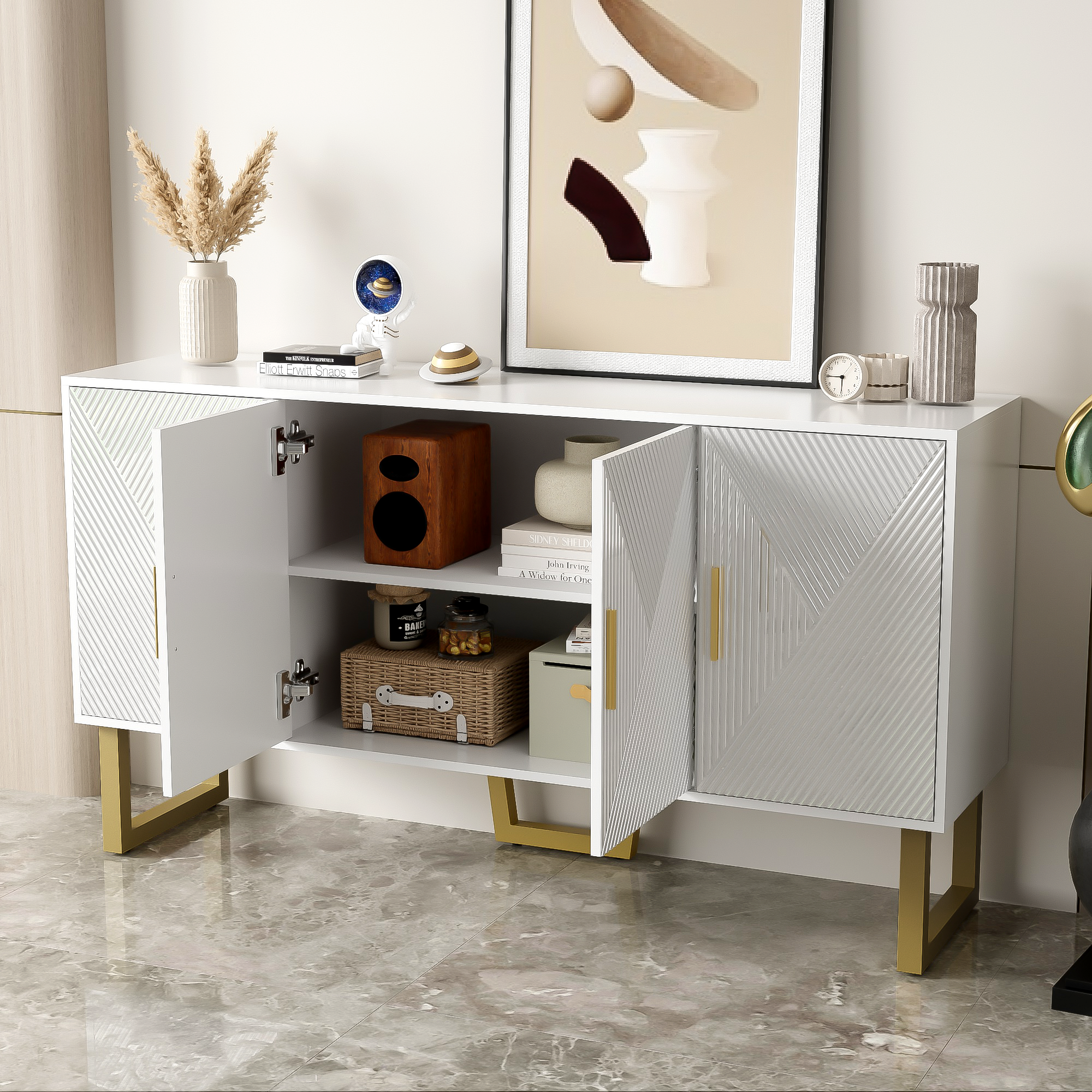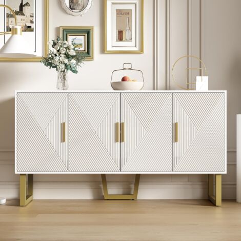 Meuble 150x40x82 Cm Blanc Brillant Buffet Avec 4 Portes 150 Cm - Garniture Texturée Brillante Et Poignées Rangement Salon Salle à Manger Moderne HOMCOM Armoire de Cuisine Buffet Cuisine Style Moderne vaisselier avec placards à Portes, étagères réglables et tiroir, Meuble de Rangement pour Salle à Manger, Salon, 76,2 x 40,2 x 183 cm, Blanc Buffet de luxe moderne - Commode à 4 portes - Portes texturées 【Pieds métalliques dorés mat】Supports stables en métal avec finition mate dorée, contribuant à l’esthétique globale et surélevant légèrement le meuble. Buffet avec texture en relief 160 cm, armoire à quatre portes Poignées dorées brossées et pieds de table brillants, blanc, 160 × 40 × 82 cm · Meuble bas · Cuisine... 【Usage adapté à plusieurs pièces】Convient au salon, à la salle à manger ou à la chambre, s’intègre dans différents espaces de vie grâce à son design sobre et moderne. 【Design moderne avec portes brillantes】 Finition lisse et surface texturée sur les portes pour un rendu visuel actuel, combinée à des poignées dorées pour un contraste élégant. 【Étagères réglables en hauteur】Possibilité d’ajuster la position des étagères à l’intérieur pour s’adapter à des articles de différentes hauteurs. Veuillez patienter 3 à 5 jours ouvrables.