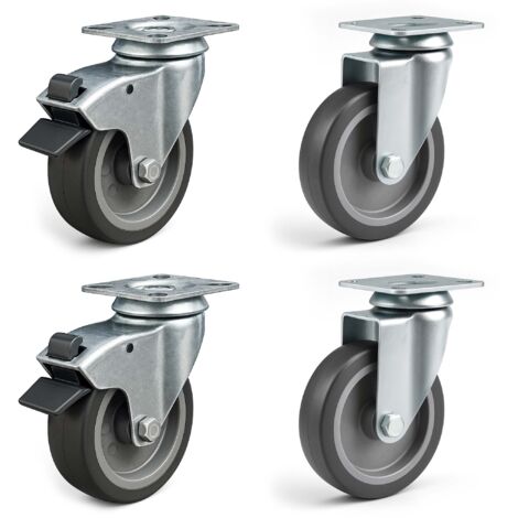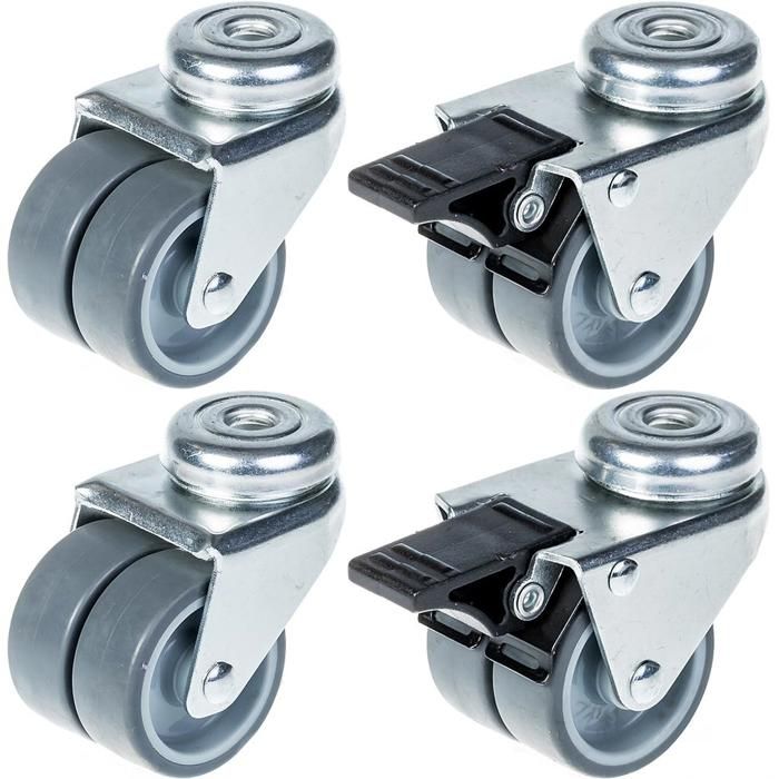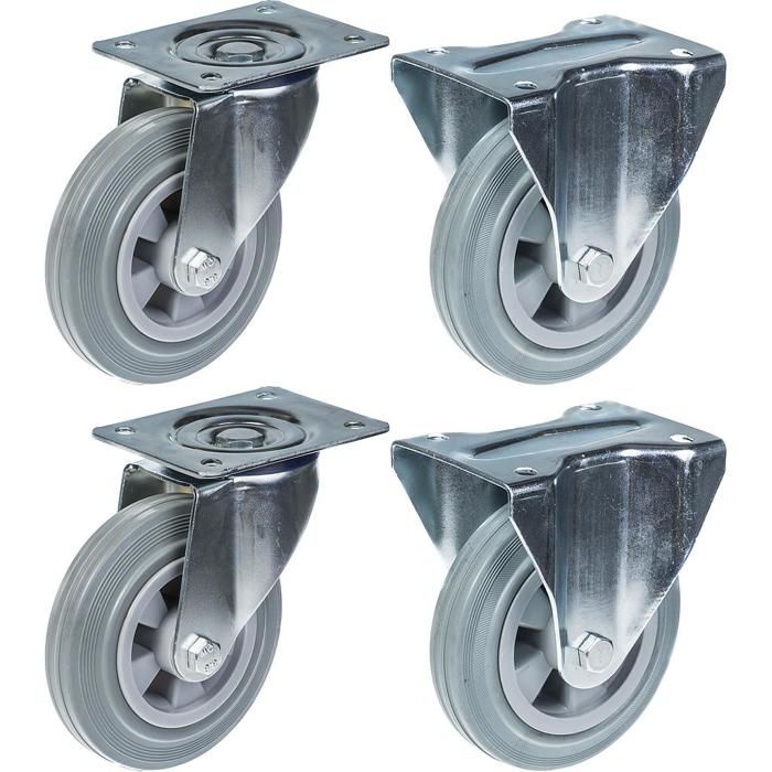 Dureté de la bande de roulement 85° Shore A. Roulettes Caoutchouc Pour Meuble Lourd Lot De 4 Roulettes Pivotantes En Caoutchouc De 125 Mm Roulettes Meuble Lourd Atelier Ces 4 roulettes fixes sont dotées de roues en caoutchouc thermoplastique massif gris avec des centres en plastique. Description de Roulette 125mm 5 frein gris en caoutchouc & fixe capacité 520kg, jeu de 4 Ensemble de 4 - 125 mm gris en caoutchouc en caoutchouc gris avec plaque Ces 2 pivotent avec frein & 2 fixes fixes a gris solide thermoplastique caoutchouc roues avec en plastique Capacité de charge : 130 kg par roulette (520 kg par lot)., Dureté de roulement : 85 °. Ne laisse pas de traces. Roulettes pivotantes de 125 mm (5), pneus pleins en caoutchouc gris, capacité de charge de 520 kg, lot de 4 · Commander et payer via · Livraison offerte par... Centres du trou de montage : 80 x 60 mm. Dimensions de l'article comme suit : diamètre de la roue : 125 mm. Bonne résistance chimique à de nombreuses substances. Set de roulettes - Set de 4 roulettes pivotante avec double frein - à Largeur de la bande de roulement : 32 mm., Roulement à billes. Ces 4 roulettes fixes disposent de roues solides en caoutchouc thermoplastique gris avec des centres en plastique.