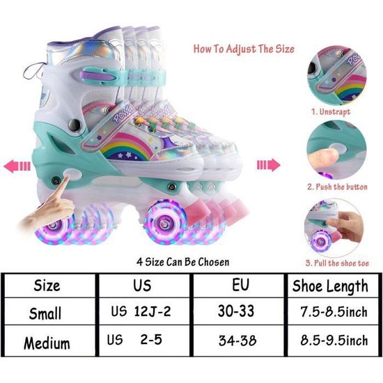 Le revêtement rembourré et respirant garde les pieds frais et confortables, même après des heures de patinage. Roller Enfant Fille BELEEV Patins à Roulettes 4 Taille Réglable, Skate Enfants Avec 8 Roues Patin à Roulettes Jouéclub Pour rendre le patinage encore plus amusant, nous avons inclus une paire de lacets lumineux offerts qui brillent à chaque pas. 4 roues LED lumineuses blanche pour le patinage à quatre roues... Que ce soit sur les planchers en bois à l’intérieur ou les trottoirs à l’extérieur, les enfants glissent sans effort. La structure stable à 4 roues apporte une balance supplémentaire, idéale pour les débutants qui apprennent à patiner et les patineurs qui pratiquent de nouvelles astuces. Que ce soit pour faire du sport, s’amuser ou tout simplement pour se déplacer, les patins à roulettes sont les meilleurs alliés des beaux jours. Convenant aux adultes, débutants, sportifs et amateurs de roller derby, ils se prêtent à toutes les balades au même titre que les rollers. Les... Glisse fluide et design stable: Nos patins à roulettes pour enfants sont équipés de roulements puissants ABEC-7 et de roues en polyuréthane 82A amortissantes — pour une glisse fluide, silencieuse et stable. Ainsi, vous n’aurez pas besoin d’acheter de nouveaux patins chaque saison. Le robuste frein avant en caoutchouc permet un freinage rapide et régulier, aidant les débutants à contrôler la vitesse et à prévenir les chutes. Patins à roulettes Super Blades X Pro, roues LED, réglables - Blanc Les patins supportent jusqu’à 60 kg, idéal pour les jeunes patineurs et ceux en plein développement. Confortable et respirant: Avec un design de baskets hautes, ces patins à roulettes pour filles offrent un soutien de cheville renforcé et une stabilité réduisant le risque d’entorse.
