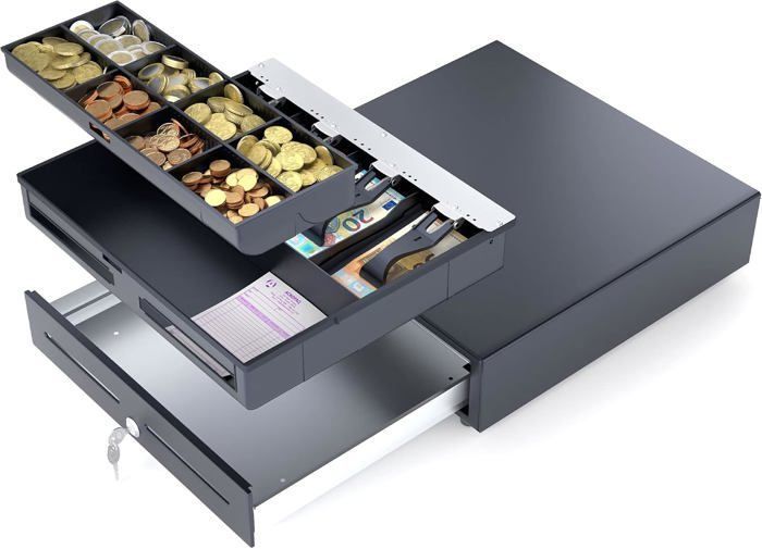 Monnaie Tiroir De Caisse Enregistreuse Avec 5 Compartiments Billets Et 5 Compartiments Monnaie Et 2 Clés Tiroir Caisse Contenu de la livraison : 1 tiroir de caisse enregistreuse., 2 clés Tiroir à Billets 5 Compartiments 8 Cases Pièces ACROPAQ Tiroir Caisse 42x41x10 Cm- Compatible Avec Caisse Enregistreuse RJ11, 4 Compartiments Tiroir Caisse A Monnaie Et Billets Dimensions du colis : 48,5 x 46 x 16,5 cm., Poids brut : 5,2 kg., Poids net : 4,94 kg. Le tiroir-caisse est une serrure à trois niveaux, mise à niveau en trois étapes : automatique, verrouillé et rebond à clé. La caisse à monnaie est divisée en deux couches de structure métallique externe, et l'intérieur est une partie en plastique intégrale Tiroir-caisse en acier robuste avec 5 compartiments pour billets et 8 compartiments pour pièces, 2 modes de déverrouillage et un design compact idéal... 【Haute compatibilité】 : l'interface RJ11 standard et le câble de connexion permettent de se connecter à différentes caisses enregistreuses et imprimantes de reçus, répondant ainsi à vos différents besoins d'utilisation. 【Durable】: l'acier et le plastique de haute qualité avec une peinture au four exquise et un procédé de moulage par injection rendent ce produit robuste, résistant aux rayures, aux chocs et pas facile à corroder et à déformer, ce qui garantit une longue durée de vie. Son aspect noir le rend compatible avec différents environnements commerciaux. Caractéristiques techniques : Matériau : acier, plastique, caoutchouc Couleur : noir Procédé : couleur de cuisson, moulage par injection Style : moderne Forme : angle droit Type de montage : plateau de table Interface : RJ11 Nombre de fentes pour factures: 5 Nombre de compartiments à pièces : 8., Dimensions du produit : 42,5 x 40,5 x 10 cm. 【Grande capacité de stockage】: Il y a 5 compartiments indépendants pour ranger les billets de banque et 8 compartiments à pièces à l'intérieur du tiroir, ce qui vous permet de classer et de stocker facilement des billets de banque et des pièces de monnaie de différentes valeurs nominales. (Veuillez le manipuler avec précaution pour éviter les dommages causés par une force excessive)., 2., Connectez la caisse à monnaie à l'interface correspondante de l'hôte ou de l'imprimante.