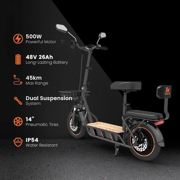 Kukirin c1 pro trottinette électrique avec siège, pneus tout-terrain 14 Le système de gestion de charge intelligent peut également protéger efficacement la batterie et prolonger sa durée de vie, garantissant que chaque départ est plein d'énergie sans une longue attente. Trottinette Electrique Kukirin Trottinette Électrique KuKirin C1 Pro Scooter électrique ,moteur 500 W, Batterie 48 V 26 Ah Pneu 14 Pouces Max 45 Km Selle Arriere Panier Avant Retroviseur Arriere Trottinette 500w Autonomie 100km Charge rapide intelligente : Le chargeur rapide intelligent 3 A équipé réduit considérablement le temps de charge et permet à votre voiture de récupérer rapidement. Trottinette électrique KuKirin C1 Pro – Batterie au lithium de nouvelle génération La est équipée d’une batterie au lithium de nouvelle génération, plus sûre et plus durable. Grâce à sa capacité de , elle offre une alimentation stable et une réserve d’énergie suffisante pour tous vos déplacements. Ainsi, la KuKirin C1 Pro garantit une endurance remarquable au quotidien Scooter électrique KuKirin C1 Pro, moteur 500 W, batterie 48 V 26 Ah, pneu 14 pouces, autonomie maximale 100 km, pliage en un clic, siège arrière et panier... Freins à double disque avant et arrière : Le KuKirin C1 Pro est équipé de systèmes de freins à double disque avant et arrière, qui réagissent rapidement et ont un excellent effet de freinage. Rétroviseur : La version améliorée du KuKirin C1 Pro est dotée de réflecteurs. Même à grande vitesse, il peut réaliser une décélération en douceur, vous accompagnant et rendant chaque freinage précis et fiable. Qu'il s'agisse d'une rue urbaine douce ou d'une pente légèrement difficile, il peut facilement y faire face. Les réflecteurs élargissent non seulement votre champ de vision, mais vous permettent également de connaître clairement l'environnement environnant, garantissant ainsi que chaque voyage se déroule sans souci. Avec une seule charge, vous pouvez profiter d'une autonomie de batterie sans souci jusqu'à 100 kilomètres.