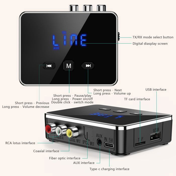 Transmetteur Récepteur Bluetooth 5.1, 2 en 1 OLED écran Adaptateur... Utilisez-le pour enseigner dans de grandes salles de classe, des visites guidées dans les musées, des réunions professionnelles, des spectacles en direct ou pour connecter votre téléviseur à un casque sans fil. Sortie audio : interface audio 3,5 mm. Prend en charge l'audio SBC, AAC et LC3 pour un son de qualité supérieure., 1 Contenu : 1 récepteur Bluetooth multifonction., 1 câble de type C. Technologie Bluetooth 5., 4 avancée : équipé des dernières fonctionnalités audio et audio de diffusion LE, cet émetteur et récepteur Bluetooth 2 en 1 assure une transmission audio sans fil stable à faible latence avec une portée allant jusqu'à 100 mètres. Design multi-entrées et multi-mode : options d'entrée AUX, MIC et Bluetooth avec modes BIS/CIS/BT. Adaptateur Audio Bluetooth, Émetteur et Récepteur Bluetooth 2 en 1, Bluetooth 5.4, Couverture 10M, Interface Multifonction - Informatique 1 manuel (français non garanti)., Adaptateur Bluetooth 5., 4 TX/RX 2 en 1 : combine les fonctions d'émetteur et de récepteur avec la technologie avancée LE Audio pour une transmission audio plus rapide, plus stable, à faible latence., 1 Portable et facile à utiliser : conçu avec un corps léger, une batterie rechargeable intégrée et un clip arrière pratique. émetteur Bluetooth Enseignement Conférence Transmetteur Récepteur Bluetooth 5.0 Longue Portée, Adaptateur Audio 3 En 1 Avec écran LCD Pour Bluetooth Longue Portée 100m Son cristallin avec micro ENC : construit avec un microphone intelligent antibruit et prend en charge les codecs SBC, AAC, LC3, cet adaptateur audio offre une clarté de qualité professionnelle même dans les environnements bruyants. Aucune alimentation externe ou pilote nécessaire, il suffit de brancher et de jouer avec des indicateurs d'état LED clairs. Design TX/RX tout-en-un - Basculez facilement entre les modes émetteur et récepteur. Automation et diffusion sans fil | Avantages Vidéo Portée de 100 m et mode de diffusion : profitez d'une couverture sans fil fiable jusqu'à 100 mètres. Tension de charge : 5 V CC. Aucune application ou pilote nécessaire pour une utilisation rapide et pratique., 1 Microphone antibruit ENC : assure une transmission vocale cristalline même dans les environnements bruyants. Capacité de la batterie : 550 mAh. Configuration flexible pour une communication un-à-plusieurs ou une écoute privée., 1
