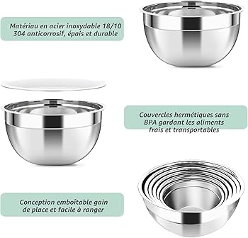 Bol Inox Cuisine Lot De 5 Bols Mélangeurs En Acier Inoxydable, Boîte De Conservation Des Ensemble Bols Cuisine Camping Bols mélangeurs en acier inoxydable 304 - bols de cuisson en métal LONOVE Bols élangeurs, Lot de 4 Avec Tais de 1.5L, 2.5L, 4L, Bols Gigognes en Acier Inoxydable... Fabriqués en acier inoxydable 201 de haute qualité, ces bols sont faciles à nettoyer, garantissant un environnement de préparation des aliments sain et sûr. La conception stable du fond assure la stabilité et la fonction empilable permet d'économiser un espace de stockage précieux. Avec différentes tailles disponibles, vous pouvez choisir la bonne capacité pour vos besoins spécifiques. Spécifications : Nom de marque : NUZAMAS Nom du produit : ensemble de bols de camping en acier inoxydable Matériau : acier inoxydable 201 Couleur : Naturel Tailles et poids : 14 cm : 14,1 cm x 12,6 cm x 5 cm, Poids : 55 g, Capacité : 480 ml 16 cm : 16,1 cm x 14,3 cm x 6,6 cm, Poids : 70,7 g, Capacité : 900 ml 20cm : 20cm x 8cm x 8cm, Poids : 107,3 g, Capacité : 1 600 ml 22cm : 22cm x 20cm x 8., 2cm, Poids : 132., 2g, Capacité : 2050ml 24 cm : 24,3 cm x 21,8 cm x 8,8 cm, Poids : 154 g, Capacité : 2 600 ml En résumé, l'ensemble de bols de camping en acier inoxydable NUZAMAS offre durabilité, commodité et polyvalence. Conception de fond stable : les bols disposent d'un fond stable, leur permettant de s'asseoir en toute sécurité sans s'incliner ni vaciller, offrant une plate-forme fiable pour vos aliments. Choisissez la taille parfaite pour différents plats ou portions de service. Applications polyvalentes : ces bols en acier inoxydable sont non seulement idéaux pour le camping et les activités de plein air, mais également adaptés pour une utilisation quotidienne dans les cuisines commerciales, les tâches de préparation des aliments, et plus encore. Chaque couvercle coloré est doté une poignée pour un retrait et un remplacement faciles du couvercle, et la conception en forme de dôme encastré permet empiler les bols à mélanger, économisant ainsi de l'espace dans votre cuisine
