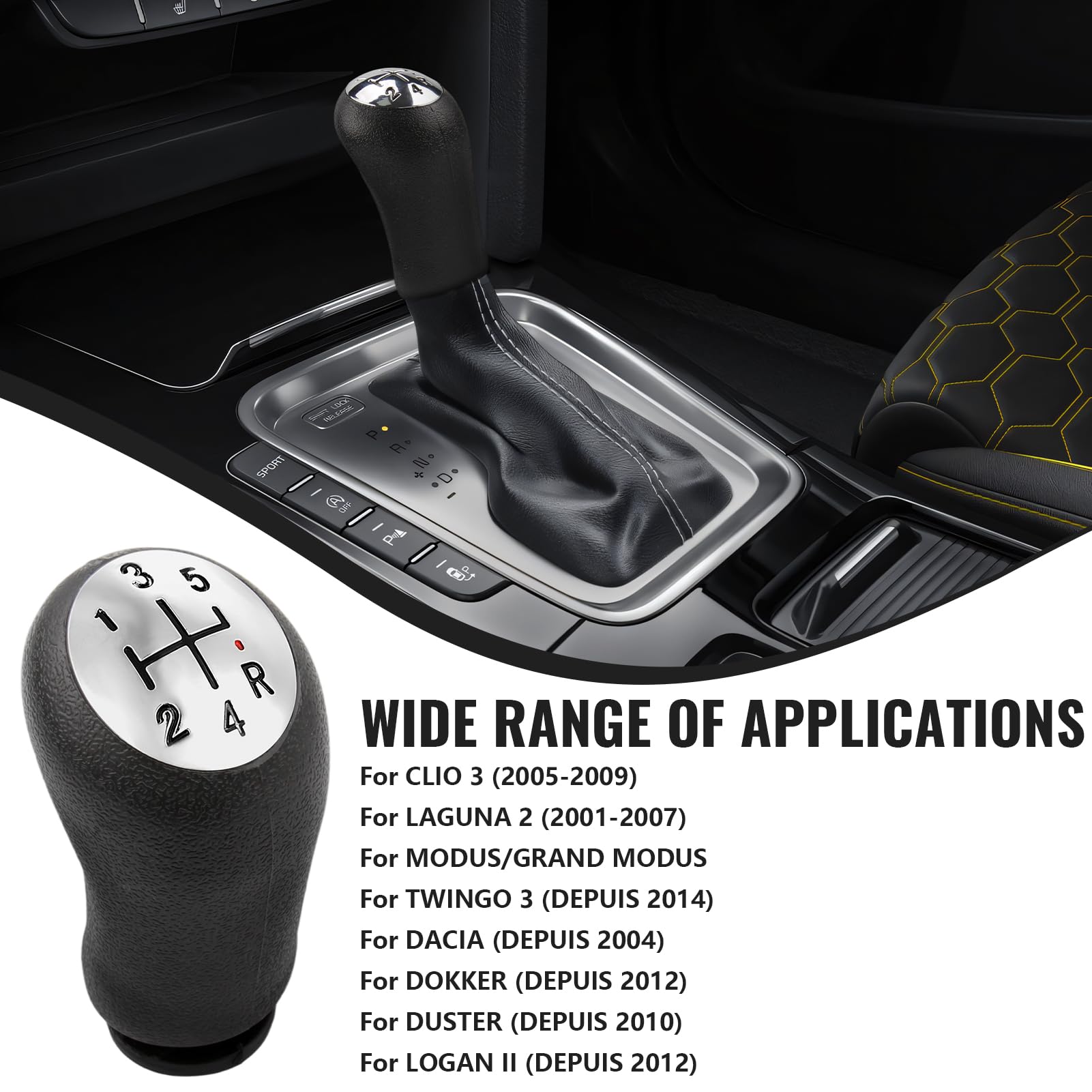 Pommeau Vitesse Renault Clio 3 Laguna 2 5 Pommeaux De Leviers De Vitesse, Pommeau Clio 3 Avec Adaptateur Pour Clio III (2005-09), Laguna 2 (2001-07), Dacia (Depuis 2004), Twingo 3 (Depuis 2014) Modus Levier De Vitesse Utilisation Fluide Levier Vitesse Dacia Logan Pommeaux levier de vitesse compatibles avec toutes les voitures, manuelles et automatiques. Choisissez parmi des modèles d’origine, sport, tuning ou automatiques Levier-pommeaux,Pommeau de levier de vitesse en cuir PU à 5 vitesses, pour Peugeot 307 308 3008 Il permet des changements de vitesse plus rapides et plus fluides, améliorant ainsi votre expérience de conduite Levier-pommeaux,Pommeau de levier de vitesse pour VW Golf 5 MK5 R32 GTD GTI 2004 2005 2006 2007... Installation Rapide: Un jeu d'outils complet, comprenant un adaptateur universel, élimine le besoin de modifier le levier de vitesses existant ; le remplacement s'effectue en seulement 2 minutes Son insert chromé résistant aux rayures est durable et ne ternit pas, ce qui en fait un choix idéal pour des années d'utilisation Pack Inclus 1 × Pommeau de vitesse 1 × Adaptateur universel Ergonomie Optimale: Le pommeau de levier de vitesses 5 vitesses présente une forme ergonomique et un design incurvé pour une prise en main confortable. Description Ce levier de vitesses 5 vitesses haute performance est compatible avec les véhicules Re-nault Cl-io III (2005-2009), Lagu-na II (2001-2007), Da-cia Logan (2004), Da-cia Du-ster (2010) Ce levier de vitesses haut de gamme améliorera votre expérience de conduite.