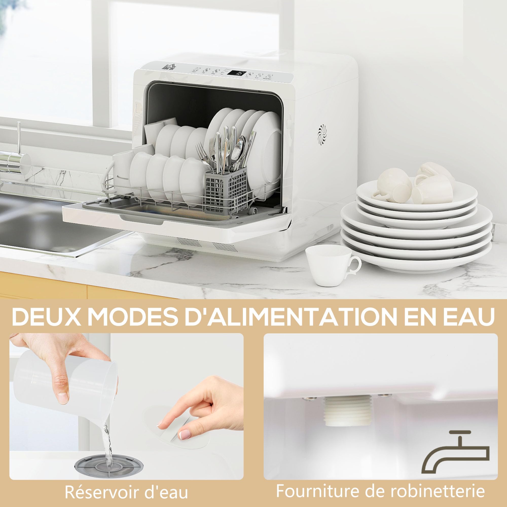 NETTOYAGE EN PROFONDEUR ET ÉCONOMIQUE : Le bras de pulvérisation rotatif du mini lave-vaisselle élimine efficacement les taches de graisse tout en réduisant la consommation d'eau jusqu'à 80 % Mini Lave Vaisselle Table Lave-vaisselle Table 5 Programmes Réservoir 6L Compact Mini Lave Lave-vaisselle Compact Petit Espace Descriptions Longues:Fatigué de perdre du temps à laver la vaisselle à la main ? Ce mini lave-vaisselle HOMCOM transforme votre quotidien avec 5 programmes adaptés à chaque besoin, un bras de lavage puissant et une capacité parfaite pour une famille de quatre personnes. Promo Lave-vaisselle 13 Couverts Beko chez Hyper U plateau : 36,5l x 33,3P x 9,9H cm ● Dim. porte-bol : 36,5l x 33,3P x 9,9H cm ● Température de séchage : 40-50℃, température de l'eau : 70℃ ● Longueur du câble : 1,5 m ● Tension/fréquence : AC 220-240V/50Hz, puissance : 840W, 3,65A ● Niveau sonore : 63 db ● Consommation électrique : 0,5 Kwh/h, consommation d'eau : 4,5 l ● Réf. Heritlux ini lave-vaisselle de table, utilisable avec et sans... totales : 45l x 44P x 45,8H cm ● Dim. Profitez d'une vaisselle éclatante sans efforts, et savourez plus de moments précieux chez vous. VAISSELLE SÈCHE ET HYGIÉNIQUE : Ce petit lave-vaisselle offre un cycle de séchage de 90 minutes et un mode de conservation d'une semaine, assurant une vaisselle propre et sans odeurs désagréables Destockage Noël : Mini lave-vaisselle - HOMCOM - 4 couverts, 5 Caractéristiques:● Mini lave-vaisselle compact avec 4 couverts, parfait pour petits espaces ● Cycle auto extra sec et mode de séchage séparé, vaisselle toujours propre ● Option de séchage 90 min, stockage hygiénique jusqu'à une semaine ● Ce lave-vaisselle peut utiliser réservoir 6L ou se connecter au robinet ● Délai de démarrage (1-12h), planifiez facilement selon votre emploi du temps ● Filtre intégré dans le mini lave-vaisselle, protège les tuyaux de drainage ● Arrêt automatique à l'ouverture de la porte, panneau LED pour sélection intuitiveSpécifications:● Couleur : blanc ● Matériaux : PP, ABS, verre trempé ● Dim. UTILISATION FLEXIBLE ET SANS INSTALLATION : Remplissez le mini lave-vaisselle manuellement avec 6L d'eau ou connectez-le facilement à un robinet grâce au tuyau fourni, parfait pour les endroits où l'accès à l'eau est limité