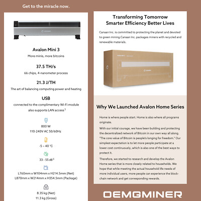 Prêt à l'emploi dès la sortie de la boîte : il suffit de le connecter à l'alimentation et à Internet, et de commencer immédiatement à miner Bitcoin (BTC) Mineur Bitcoin Avalon Mini 3 Nuevo Canaan Avalon Mini 3 37,5 Th/s Bitcoin Miner Algoritmo De SHA-256 800W Pre Mineur Btc 37.5 Th/s 800w Déballage du Canaan Avalon Nano 3 - WOYOU Silent Revolution: Avalon Q Leads a New Era of Home Mining Parfait pour une utilisation à la maison ou au bureau : faible encombrement et réduction du bruit par rapport aux mineurs industriels En stock Canaan Avalon Mini 3 BTC Miner 21., 3J/TH 37., 5 TH/s 800W 110-240V, 4 nanomètres Processus Solo Miner Miner Home Office