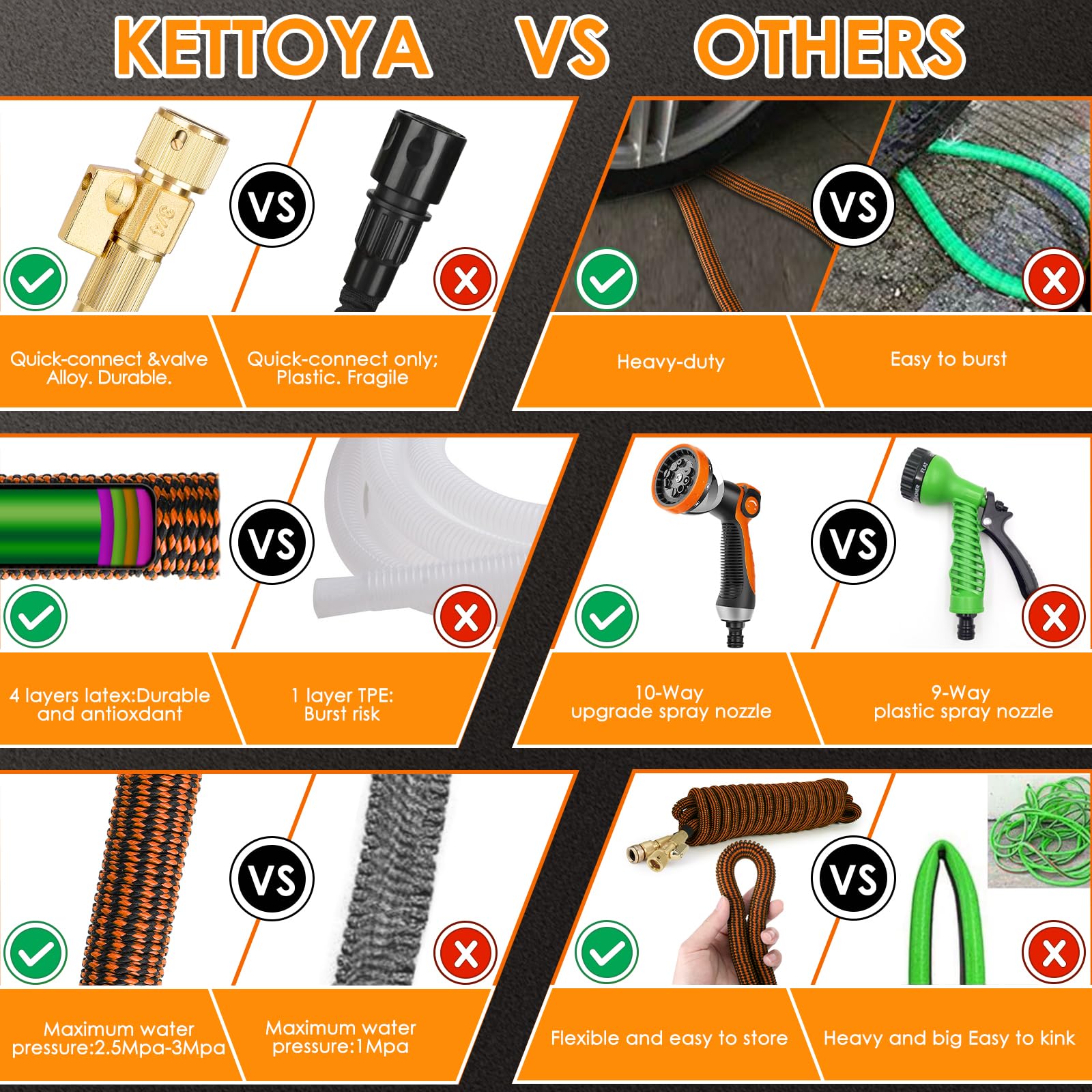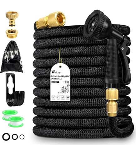 Cliquez sur « Ajouter au panier » pour obtenir votre tuyau d'arrosage Kit Arrosage Jardin Pression 12 Bars Tuyau Arrosage Extensible 15m 50ft, Tuyau D'arrosage Flexible Avec Buse Tuyau Rétractable 7.6 Mètres KETTOYA KETTOYA Tuyau d'arrosage extensible de 7,6 m avec buse de pulvérisation à 10 motifs, tuyau d'arrosage rétractable et robuste, noyau en latex à 4 couches, durable 3750D, sans nœuds, noir Tuyau D'Arrosage Extensible 3 Fois Extensible 229 M Enrouleur De Tuyau... Cela élimine le risque de fissuration, prolongeant considérablement la durée de vie du tuyau Contrairement aux tuyaux traditionnels, notre tuyau rétractable magique est léger, sans nœuds, et compact KETTOYA Tuyau Arrosage Extensible 23M 75FT Tuyau d'arrosage Flexible... Lorsque vous éteignez le robinet, le tuyau rétrécit à sa longueur d'origine de 2,4 m. La buse est également enveloppée de caoutchouc protecteur pour une meilleure performance anti-chute, et la poignée ergonomique assure un fonctionnement confortable 【Service professionnel】 : le tuyau d'arrosage extensible KETTOYA est fabriqué selon des normes strictes de haute qualité. Tuyau d'arrosage extensible de 30,5 m avec buse à 10 fonctions et Design extensible amélioré : lorsque vous allumez le robinet, le tuyau d'arrosage peut s'étendre jusqu'à 3 fois sa longueur d'origine, atteignant jusqu'à 7,6 m. Si vous n'êtes pas 100 % satisfait du tuyau d'arrosage KETTOYA n'hésitez pas à nous contacter, nous vous aiderons dans les 12 heures.
