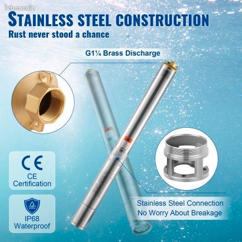 Pompe Submersible 180W 1000L/h 30m Pompe Immergée VEVOR Pour Puits 190 L/min 57 M Pompe à Eau Pour Puits Profond En Acier Inox, Pompe à Eau Électrique 1100 W, Pompe De Puits Submersible | Leroy Merlin Pompe Puits Ferme Maison Débit 1000L/H Pompe de puits profond 370W Submersible 4000 l/h Pompe à eau immergée Pompe immergée SRM 4/100 Automatique Pompe BBC multicellulaire pour puits monophasée avec coffret de démarrage et son flotteur. Garantie 2 ans.Pompe immergée BBC pour puits monophasée.Débit (en m3/h):1,2 à 6Pression (en HMT):11 à 44Optez pour cette pompe s'installant directement au fond de votre source d'eau discrète et silencieuse elle satisfera vos besoins d'eau Détails Anneaux de levage portables : Situés près de la sortie d'eau, ils facilitent le transport avec des cordes de levage. Sortie standard : Diamètre de 2,5 cm pour une connexion aisée aux tuyaux ou accessoires de pompage, économisant temps et effort. Spécifications Matériau : Acier inoxydable, Cuivre Couleur : Argent Style : Moderne Montage requis : Non Type de moteur : Moteur en cuivre pur Source d'alimentation : Électrique filaire Débit : 1,2 m³/1200 L/H Puissance : 180W Hauteur de refoulement : 30m Niveau sonore : 0-30 dB Tension : 12V Vitesse : 3000 tr/min Indice de protection : IP68 Nombre d'aubes : 1 Longueur du câble : 17m Dimensions produit (D*H) : 7,8*38,5 cm Diamètre de sortie : 2,5 cm Dimensions du colis : 38*18*10 cm Poids net : 4,5 kg Poids brut : 4,28 kg Le paquet comprend 1 × Pompe à eau 1 × Adaptateur hydraulique 1 × Manuel d'utilisation en anglais Remarques 1., Veuillez noter que la vitesse de pompage dépend de la profondeur d'immersion : plus elle est grande, plus la vitesse diminue., 2., Lisez attentivement le manuel et respectez les précautions de sécurité., 3., Interdit dans les eaux boueuses pour éviter le blocage par les sédiments et la surchauffe du moteur., 4., Veuillez noter que ce produit est uniquement pour l'eau claire (pas d'huiles, produits chimiques ou autres liquides)., 5., Température maximale du liquide : 50 °C, densité 6., La hauteur de refoulement ne doit pas être inférieure à 80 % des spécifications, sous peine de surintensité., 7., Tuyaux et filtres non inclus., 8., Vérifiez le câble et l'alimentation avant utilisation, et prenez des mesures de protection., 9., Ne fonctionnez pas à sec ou avec un niveau d'eau bas ; la pompe doit être totalement immergée., 10., Installation verticale obligatoire. Un choix judicieux pour optimiser votre système d'arrosage. Ajoutez un clapet anti-retour (non fourni) à la sortie. 【Matériaux Durables】- Fabriquée en acier inoxydable premium et moteur en cuivre, cette pompe résiste à la corrosion, aux chocs et à l'eau, évitant la déformation pour une utilisation intensive et prolongée, même dans des conditions extrêmes. 【Design Silencieux】- Son mécanisme submersible et son moteur cuivre réduisent le bruit à 0-30 dB, créant un environnement de travail paisible idéal pour les zones résidentielles ou sensibles au bruit. Pompe de puits profond forage 4 4000L/H 750W 6.7bar Pompe à eau...