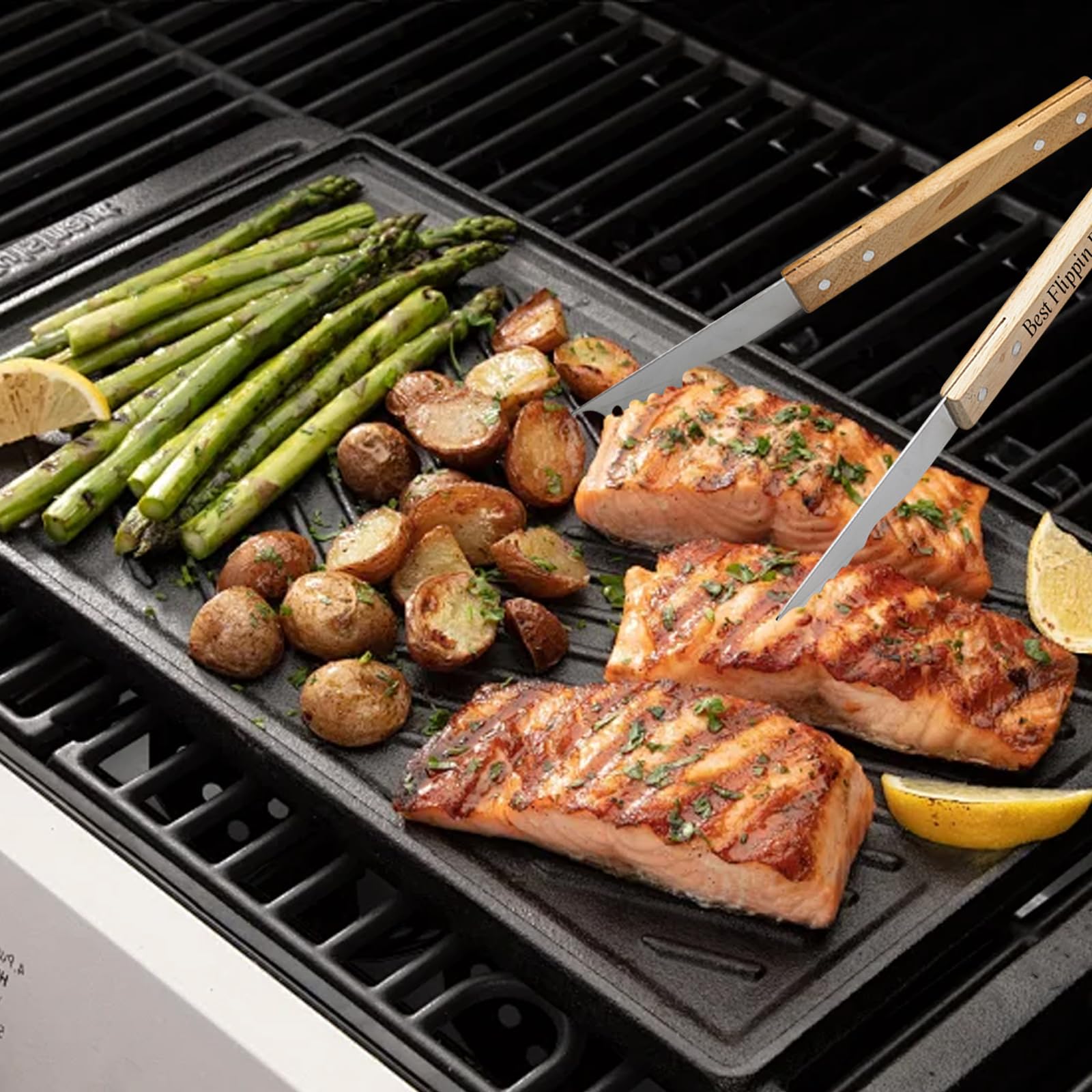 Spatule ou ensemble d'outils de barbecue personnalisés : ces outils de barbecue personnalisés sont le cadeau parfait pour la fête des pères ou Noël pour papa ou grand-père Ce sont de fantastiques cadeaux personnalisés Ils peuvent être personnalisés en choisissant des icônes, en saisissant les noms des membres de la famille et les phrases préférées. Matériaux de haute qualité : toutes avec des poignées en bois naturel avec des contours lisses pour une prise en main confortable. Ils sont équipés de bords dentelés des deux côtés et d'un décapsuleur sur le devant, ce qui permet de manipuler facilement de grandes coupes de viande et de créer le barbecue parfait. Il s'agit peut-être du dernier ensemble d'outils de barbecue dont vous aurez besoin, équipé des trois outils de base nécessaires pour toutes les tâches de cuisine en plein air. Ustensile de gril personnalisé - France Ce qui en fait le cadeau idéal pour tout maître du barbecue ou toute personne cherchant à améliorer son expérience de grillade. Fabriqués en acier inoxydable incroyablement robuste et ornés d'une finition classique en grain de bois, ces outils s'intègrent parfaitement dans n'importe quel décor d'intérieur ou de jardin. Pour votre papa, beau-père, petit copain, grand-père ou encore votre fils ... Vous trouverez également des accessoires indispensables comme les pinces à barbecue... Améliorez leur jeu de barbecue avec cet ensemble d'accessoires de barbecue personnalisés de haute qualité. Améliorez vos vieux outils de barbecue rouillés ou commencez à nouveau avec notre ensemble d'ustensiles de barbecue en séquoia. Les poignées des outils de barbecue sont extra longues, gardant vos mains loin de la source de chaleur, ce qui rend le barbecue plus facile. Ustensiles Barbecue Avec Décapsuleur Ensemble Outils Grill Kit Accessoires Barbecue The Grillfather - 6 Outils Inox + 4 Tapis Téflon - Cadeau Parfait Pour Papa Ensemble Outils Barbecue Inox étui Ustensiles Grill Acier Inoxydable Mettez le feu au gril avec nos accessoires de barbecue personnalisés. Des spatules et pinces gravées aux sets de grillades de marque, ces outils durables sont parfaits pour les événements estivaux, les cadeaux d'entreprise ou les objets publicitaires pour les amateurs de cuisine Après utilisation, vous pouvez les ranger dans l'armoire de cuisine.