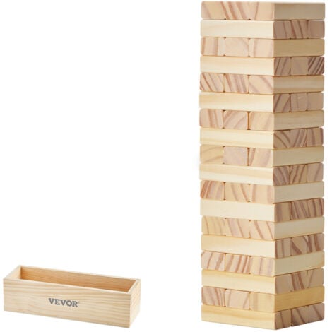 Remarque : rangez-le dans un endroit sec lorsqu'il n'est pas utilisé pour prolonger sa durée de vie. Jeu Familial Bois Extérieur VEVOR Jeu De Tour En Bois, 60 Blocs, Tour Géante De Blocs Empilables En Tour Culbutante Intérieur Extérieur Description du produit Ce jeu de blocs de tour est fabriqué en bois de pin de qualité supérieure pour une utilisation durable. Tour mobile en bois à partir de 3 ans, tour empilable, jouet éducatif à partir de 3 ans, jeux d'adresse à partir de 4 ans, enfants garçons et filles Bois de pin de qualité supérieure : fabriqué à partir de bois de pin de haute qualité, ce jeu de blocs de tour à bascule est durable et conçu pour résister à un jeu intense. Idéal pour de multiples situations : ce jeu de tour de culbute est idéal pour une utilisation en intérieur et en extérieur, y compris dans les jardins, les pelouses, les plages et plus encore. Tour en bois à bascule : chaque bloc mesure 7,6 x 2,5 x 1,5 cm, avec une hauteur d'empilage initiale de 28 cm. Le jouet en bois à bascule peut atteindre jusqu'à... Construisez et concevez votre propre tour en bois pour un plaisir sans fin. Vous pouvez également personnaliser le jeu en écrivant vos propres règles sur les blocs vierges ou en les utilisant pour gribouiller comme pièces décoratives. Il est idéal pour les réunions de famille, les anniversaires, les barbecues, les pique-niques, le camping et même pour jouer en solo. VEVOR Ensemble de blocs de bois Jeu Empilable en Bois Jouet d Tour en bois à bascule : chaque bloc mesure 7,6 x 2,5 x 1,5 cm, avec une hauteur d'empilage initiale de 28 cm. Il est idéal pour le rangement et pratique pour s'amuser en déplacement.
