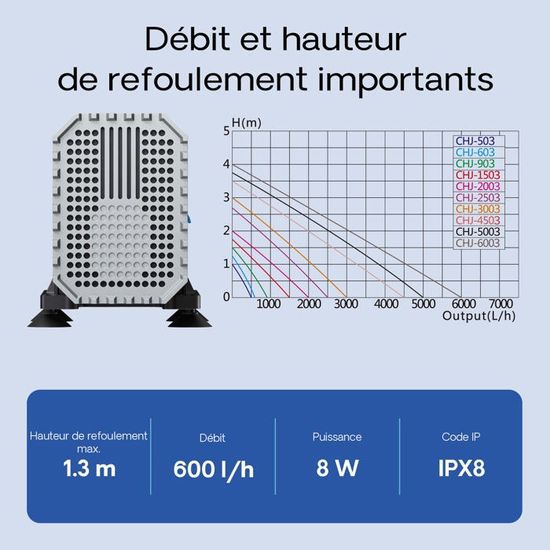 Filtration - pompe,pompe à eau réglable pour aquarium,submersible,récif... Économie d’énergie Par exemple, une réduction de 5 watts équivaut à environ 43,8 kWh économisés sur un an. Cycles de circulation recommandés Le cycle dépend du type de bassin. [Embouts interchangeables] – Fournie avec un tube télescopique et plusieurs embouts pour fontaine, cette pompe pour bassin offre une flexibilité maximale. Pour une piscine naturelle, les exigences personnelles et la végétation détermineront le besoin de circulation. Pompe de bassin SunSun CHJ-603 : performance et faible consommation La pompe SunSun CHJ-603 de 600 l/h avec 8 watts est l’un des modèles les plus efficaces du marché. Elle permet de varier les effets d’eau en fonction de vos préférences esthétiques, tout en favorisant l’enrichissement en oxygène et l’attractivité visuelle du bassin Sanders & Sanders Wandtattoo Paw Patrol Rot Gelb und Grün 65 x 85 cm 600176 kaufen bei [Consommation de 8 watts] – Grâce à sa faible consommation de seulement 8 watts, cette pompe fontaine est idéale pour un fonctionnement en continu. Appareil polyvalent pour plusieurs usages La CHJ-603 combine les fonctions de pompe de cours d’eau, de fontaine et de filtration. Pompe à Eau Bassin SunSun CHJ-603 ECO Adjustable Water Pump – 215 X 65 X 85 Mm Pompe Réglable Bassin Jardin Cette pompe est donc un choix judicieux pour les bassins privés souhaitant allier performance et économie. Réglage précis du flux Grâce à son réglage d’arrivée d’eau intégré, vous ajustez facilement le débit selon vos besoins. Elle se distingue par une consommation réduite d’énergie, ce qui la rend idéale pour un fonctionnement continu tout en limitant les coûts d’électricité. Pompe a Fontaine 1000L-H 15W Débit D'Eau Réglable Pompe a Eau... [Réglage du débit] – La pompe SunSun CHJ-603 dispose d’un réglage d’arrivée d’eau intégré, offrant une adaptation précise du débit selon les besoins de votre bassin. Compatibilité avec les filtres de bassin Un débit adapté à la capacité du filtre est essentiel. Un entretien régulier prolonge la durée de vie de la pompe de filtration et garantit une performance constante, même en cas d’utilisation prolongée dans des conditions exigeantes Ce contrôle optimise le fonctionnement de la pompe pour fontaine et assure un équilibre parfait entre la circulation d’eau et les exigences de filtration La pompe fonctionne en continu de 0 à 100 %, ce qui permet une adaptation parfaite à chaque installation. [Entretien simplifié] – Le boîtier de la pompe a été conçu pour un accès rapide sans outils, ce qui facilite grandement le nettoyage.