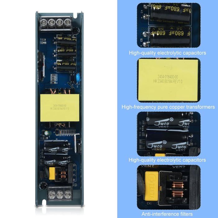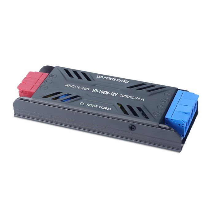 Ce driver LED universel convient à une multitude d’applications : bandes lumineuses LED, lampes de garde-robe, modules LED 12V, panneaux lumineux intérieurs, enseigne LED, projecteurs LED MR11/GU10, rubans à pixels, et même certains éclairages extérieurs protégés. Alimentation 220V 12V Ultra Mince Transformateurs D'éclairage Muets DC 12V 24V 60W 100W 200W 300W 400W, Alimentation LED Ultra Fine, Convertisseur A/D, Pilote Pour Bandes LED Transformateur LED 12V 100W 【Polyvalence d’Application】Ce transformateur LED 12V 100W peut être installé dans un espace sec et ventilé ou fixé au mur. Compatible avec bandes lumineuses LED 12V, lampes de placard, modules LED, panneaux lumineux, enseignes, rubans pixels et éclairages décoratifs basse tension. La sécurité et la performance sont garanties pour vos projets d’éclairage. Installation simple en parallèle. Transformateur 220V 12V étanche IP67 100W DC 8.33A Avec une entrée AC 180-264V et une sortie DC 12V à tension constante, il délivre jusqu’à 8,3 ampères pour une puissance maximale de 100W. Avec ce transformateur 220V 12V LED 100W ultra mince, vous bénéficiez d’un adaptateur robuste, durable et polyvalent, parfaitement adapté aux projets d’éclairage domestiques et professionnels. Cela garantit une alimentation stable et prolonge la durée de vie de vos dispositifs LED sans scintillement ni bruit. Idéal pour installations murales ou encastrées, il garantit une longue durée de vie et une stabilité optimale de l’alimentation. En cas de problème, notre service client est à votre disposition pour une solution rapide et satisfaisante. Alimentation mince IP67 100W transformateur étanche 230V à 12V dc 8.3A... LED Transfo]La charge maximale de LED transfo est de 100W, tension d'entrée AC 220V, 50/60 Hz, sortie DC à tension constante: 12V, courant de sortie 8,3A. Conception compacte, seulement 22 mm d'épaisseur. Notez que le transformateur n'est pas dimmable Grâce à son design compact (1305022 mm) et sa construction en aluminium ultra-mince, il offre une installation simple et discrète dans les espaces les plus réduits. Sa conception avec dissipation thermique en nid d’abeille assure une meilleure circulation de l’air, permettant au transfo de maintenir des performances élevées tout en évitant la surchauffe. 【Veuillez Noter】Ce transformateur 220V 12V LED n’est pas dimmable. Le transformateur 220V 12V LED driver 100W ultra mince est conçu pour fournir une alimentation stable, fiable et sécurisée à tous vos dispositifs LED fonctionnant en basse tension.