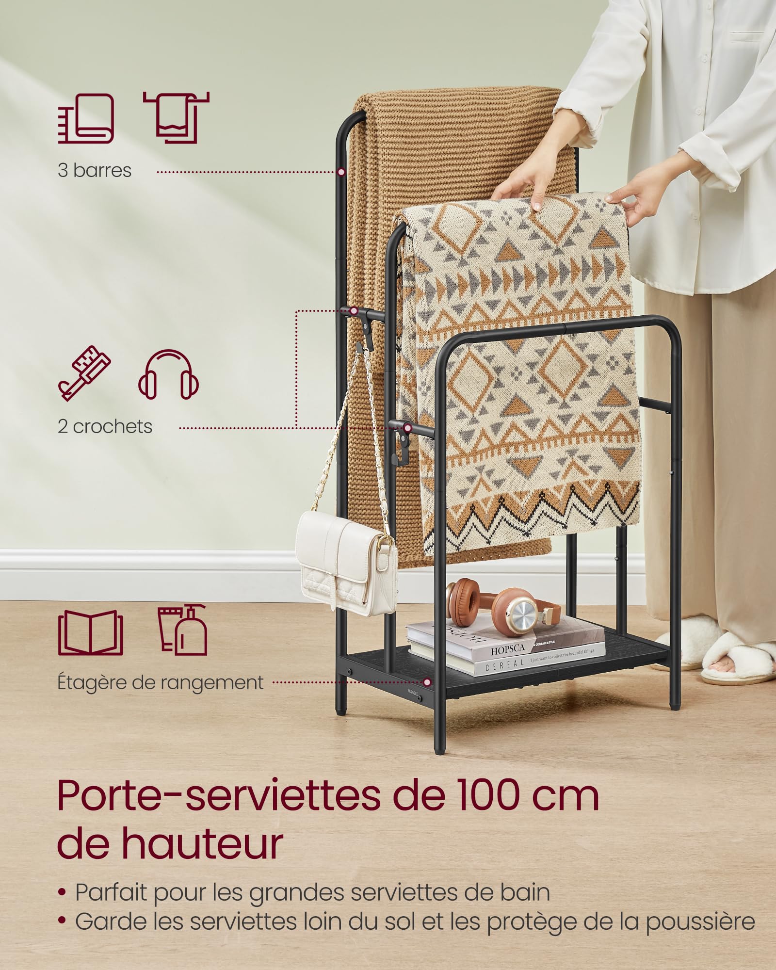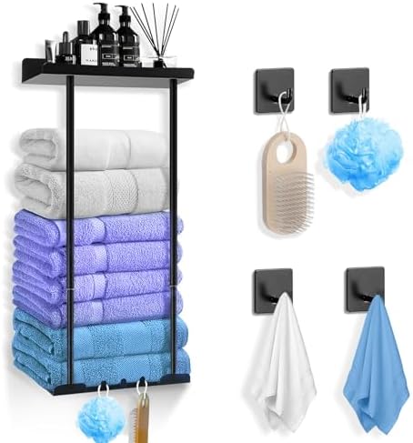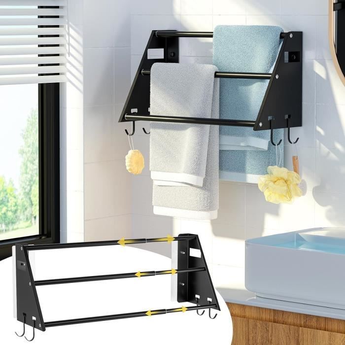 Porte Essuie Salle De Bain Sans Percage Porte-Serviettes Auto-Adhésif Antirouille Noir 60cm Porte Serviettes Salle De Bain Mural Pliable Étagère Serviette Avec Crochets,2 étages Sèche-Serviettes En Aluminium Bois Antirouille,Tiges Porte-serviettes Réglable 38-75cm 3 Crochets 20kg Noir Optez pour un porte-serviette spécialement conçu pour être fixé sur la porte. Pratique et peu encombrant, ce type de porte-serviette vous permet de suspendre vos serviettes de bain ou vos peignoirs à portée de main [Conception de rangement unique]rangement serviette salle de bain Il y a des plates-formes en haut et en bas pour placer des articles, et 3 crochets en bas pour ranger des boules de bain, des serviettes et d'autres articles Porte Essuie Salle De Bain Sans Perçage Range Serviette Salle De Bain... [Le matériau est antirouille et résistant à la corrosion] support serviette salle de bain Fabriqué en acier au carbone de haute qualité, pulvérisé avec de la peinture noire mate, résistant à l'humidité et à la rouille, bonne texture, beau et durable [Hauteur réglable] porte serviette salle de bain Avec une conception rétractable, la hauteur peut être ajustée dans la plage de 38 à 75 cm, quelle que soit la taille de votre salle de bain, elle peut parfaitement s'adapter à votre espace et fournir la meilleure solution pour ranger les serviettes