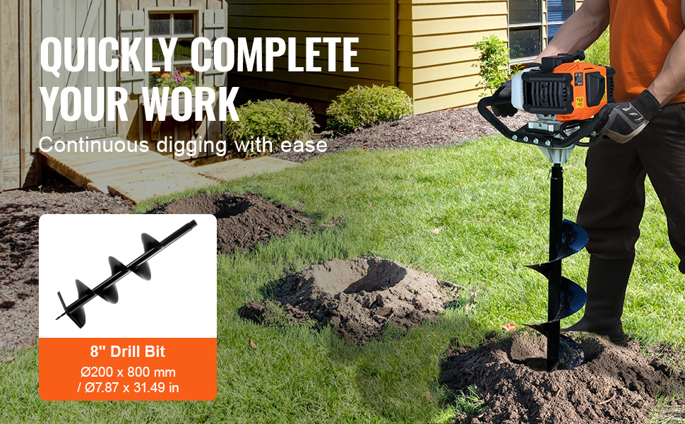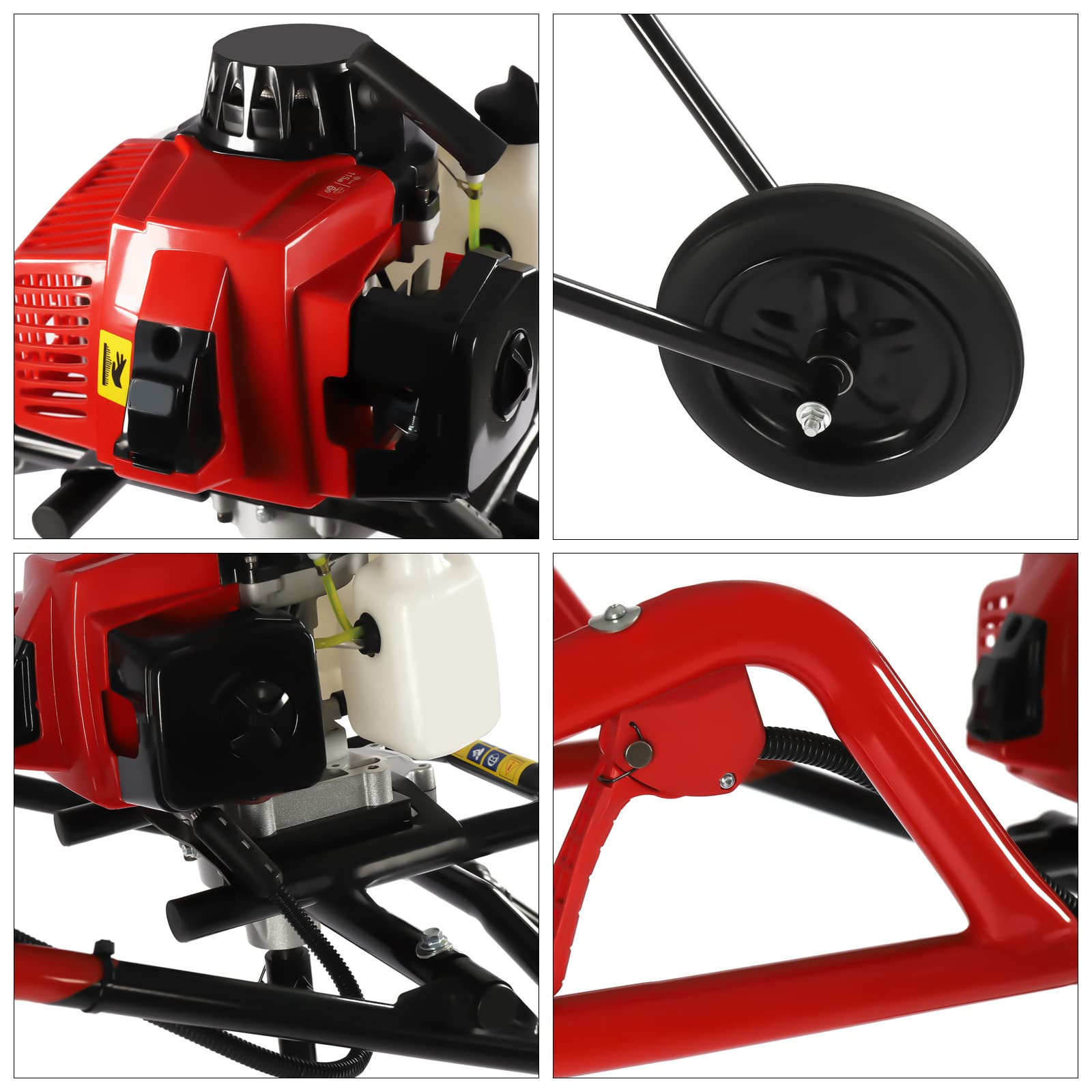Tarière à Essence VEVOR , 63 CC, Tarière Thermique De Tarière Professionnelle Chariot Réservoir Tarière à essence à 2 temps 71 CC à essence monocylindre refroidi par... 52cc Tarière Thermique essence Earth Auger Machine à essence 4 6 Solide et durable : il est principalement composé de fonte de haute qualité, d'aluminium et d'acier allié, et sa surface est traitée avec la technologie de peinture par pulvérisation, ce qui le rend plus résistant à l'usure et plus robuste. otoculteur à essence à 2 teps 52 c³ - otoculteur refroidi par air... Bonne dissipation de la chaleur : un excellent système de refroidissement à air forcé et des trous de refroidissement denses peuvent dissiper instantanément la chaleur et refroidir le moteur et protéger le moteur pour un travail durable. Longue endurance : avec un grand réservoir de carburant (0,34 gal) et une faible consommation de carburant (544 g/kW. Il garantit des performances fiables sans recharges fréquentes. Lorsqu'il est utilisé en conjonction avec un foret à coupe haute dureté (11,81 pouces), il peut obtenir un perçage rapide et améliorer l'efficacité du travail.