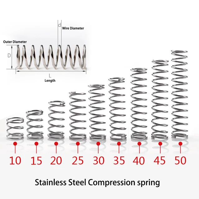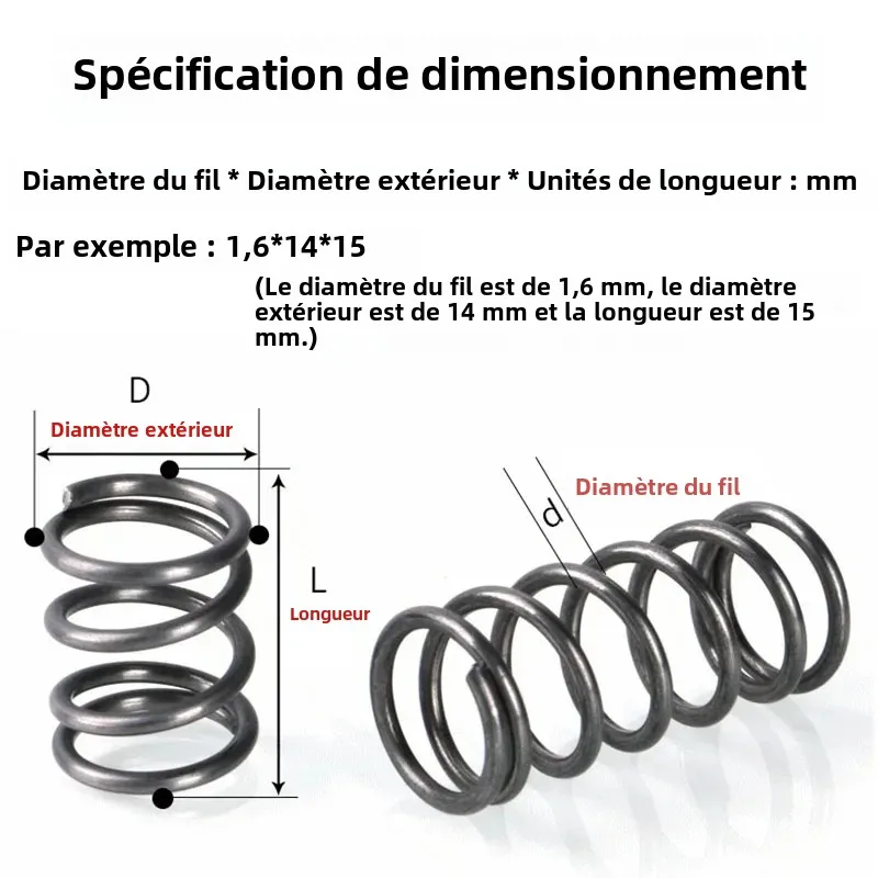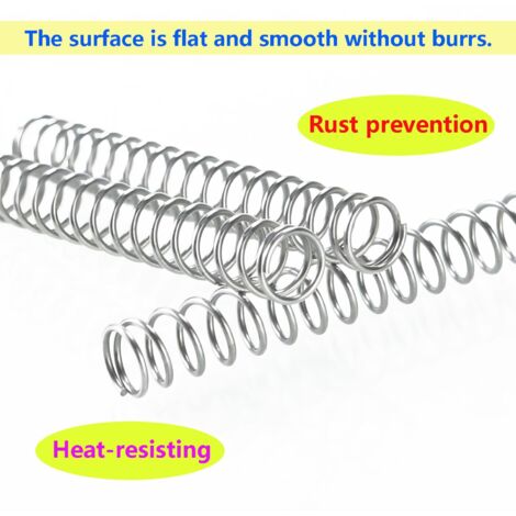 Ressorts Acier 42mm OD 30mm Longueur Ressorts Compression Acier 2 Pièces - 42mm OD, 5mm Fil, 30mm Longueur | Ressorts Traction Durable Ressorts Acier Qualité Industrielle La gamme de ressorts de compression standard couvre les longueurs allant de 2,00 mm jusqu’à 1 080,00 mm. Cette gamme est produite conformément aux normes DIN actuelles et dans les qualités supérieures demandées en Europe et en Amérique Ressorts Industriel Ressort Industriel Ressort Compression Acier 65Mn - 2 Pièces - Fil 6mm, Diamètre 34mm, Longueur 200mm - Pour Machines Industrielles Ressort Tamis Vibrant 200mm 5 Pièces Ressorts Mécaniques Fabriqué avec une attention méticuleuse aux détails et fabriquéà partir d'acierà ressort de haute qualité, ce ressort de compression est conçu pour répondreà vos besoins avec précision et fiabilité. Que vous en ayez besoin pour des projets automobiles, industriels, domestiques ou de bricolage, ses performances fiables et sa durabilité en font un choix idéal. Dimensions : diamètre du fil : 0,8 mm, diamètre extérieur : 14 mm, longueur libre : 30 mm. Ressort de compression en acier inoxydable 304, haute résistance... Ce ressort de compression est une solution polyvalente adaptéeà de nombreux usages. Solution polyvalente: adapté aux projets automobiles, industriels et domestiques, notre ressort de compression offre une polyvalence et des performances fiables dans diverses applications. Facileà installer: avec sa conception universelle et ses dimensions standard, l'installation de notre ressort de compression en acierà ressort est un jeu d'enfant pour les professionnels et les bricoleurs. Performances améliorées: notre ressort de compression en acierà ressort offre des performances exceptionnelles, fournissant la force et la stabilité nécessaires pour une large gamme d'applications.