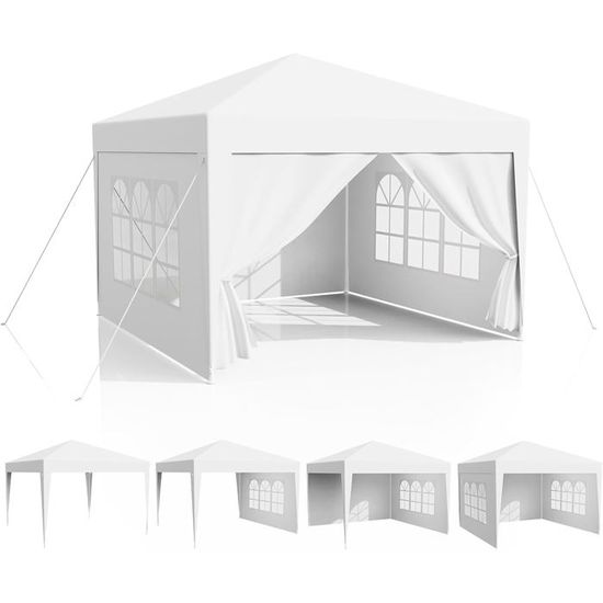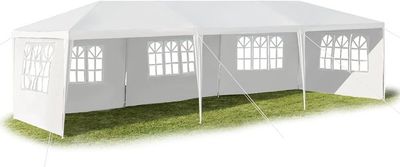 Ce pavillon blanc élégant est la solution parfaite pour toutes vos occasions festives en extérieur., Cractéristiques : 1., Matériau : Tube en fer et tissu PE 2., Couleur : blanc 3., Dimensions : 900 x 300 x 260cm (L x L x H) 4., Poids : 19 kg 5., Résistant à l'eau : Oui 6., Convient pour : Maison, mariage, fête, parking, etc. COSTWAY Tonnelle de Jardin inclut 4 Murs Amovibles avec Fenêtre sur [Polyvalence] Idéal pour les mariages, anniversaires, fêtes de jardin et autres célébrations. Barnum 3x9 COSTWAY Tonnelle De Jardin 3x6M Avec 6 Parois Latérales Amovibles, Tente De Reception Chapiteau événement Mariage Festival Que ce soit pour un mariage, une fête ou toute autre célébration, ce pavillon transformera votre événement en un moment inoubliable. Veuillez l'ancrer solidement au sol avant utilisation. COSTWAY Tonnelle de Jardin Extérieur/Barnum 3x9m-27㎡ Tente de Réception avec 5 Parois Amovibles... [Montage facile] Notre tente de réception s’installe rapidement et sans effort, vous permettant de vous concentrer sur l’essentiel : organiser et profiter de votre fête ! [Structure stable] Notre pavillon utilise un système de tubes filetés pour un maintien renforcé. Tonnelle de jardin | Tente de réception escamotable pliable avec 5 parois 3x9m Blanc CFW63772... [Matériaux haut de gamme] Fabriqué en toile PE résistante et imperméable, cet auvent de jardin assure une excellente protection contre les rayons UV et les petites intempéries. Évitez de l'utiliser pendant les orages ou les conditions météorologiques défavorables. Des cordeaux et piquets sont inclus pour une fixation solide au sol. Avec ses fenêtres élégamment conçues, il allie fonctionnalité et esthétique raffinée. Notre tente de jardin peut également servir comme stand de vente ou d’information lors de marchés ou festivals.