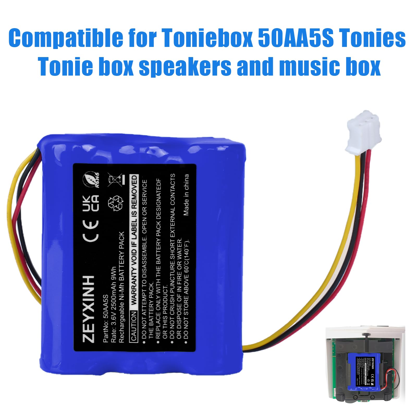Batterie Ni-MH 3.6V Batterie 7.2V 0.3Ah Ni-MH Pour KINETIC MH330AAAK6HC Batterie Compatible 50AA5S Tonies Mon premier coffret Toniebox France À propos de cet article... vhbw Akku für tonies Toniebox, 3.6V, Ni-MH, 2200mAh ab 10,99 Batterie de remplacement de haute qualité : Batterie NIMH haute performance 2500 mAh, rechargeable et durable, prolongez la durée de vie de votre Toniebox avec cette batterie de remplacement 50AA5S Batterie Ni-MH 3.6V 2000mAh type 50AA5S Pour Toniebox Tonie Box ; Dimension · 52.10 x 43.50 x 15.00mm ; Expédition, renvois et paiements · L'acheteur paie les frais... Veuillez utiliser uniquement des chargeurs adaptés pour charger cette batterie de remplacement. Compatibilité : Compatible avec Toniebox Tonie Box 50AA5S, cette batterie de remplacement a les mêmes caractéristiques de performance que la batterie Toniebox d'origine Certifié en matière de sécurité : La batterie toniebox a passé la certification CE FCC ROSH. Spécifications : Capacité : 2500 mAh, Tension : 3., 6 V, Performance énergétique : 9 Wh, Type de cellule : NIMH - Pas d'effet mémoire grâce à la technologie NI-MH