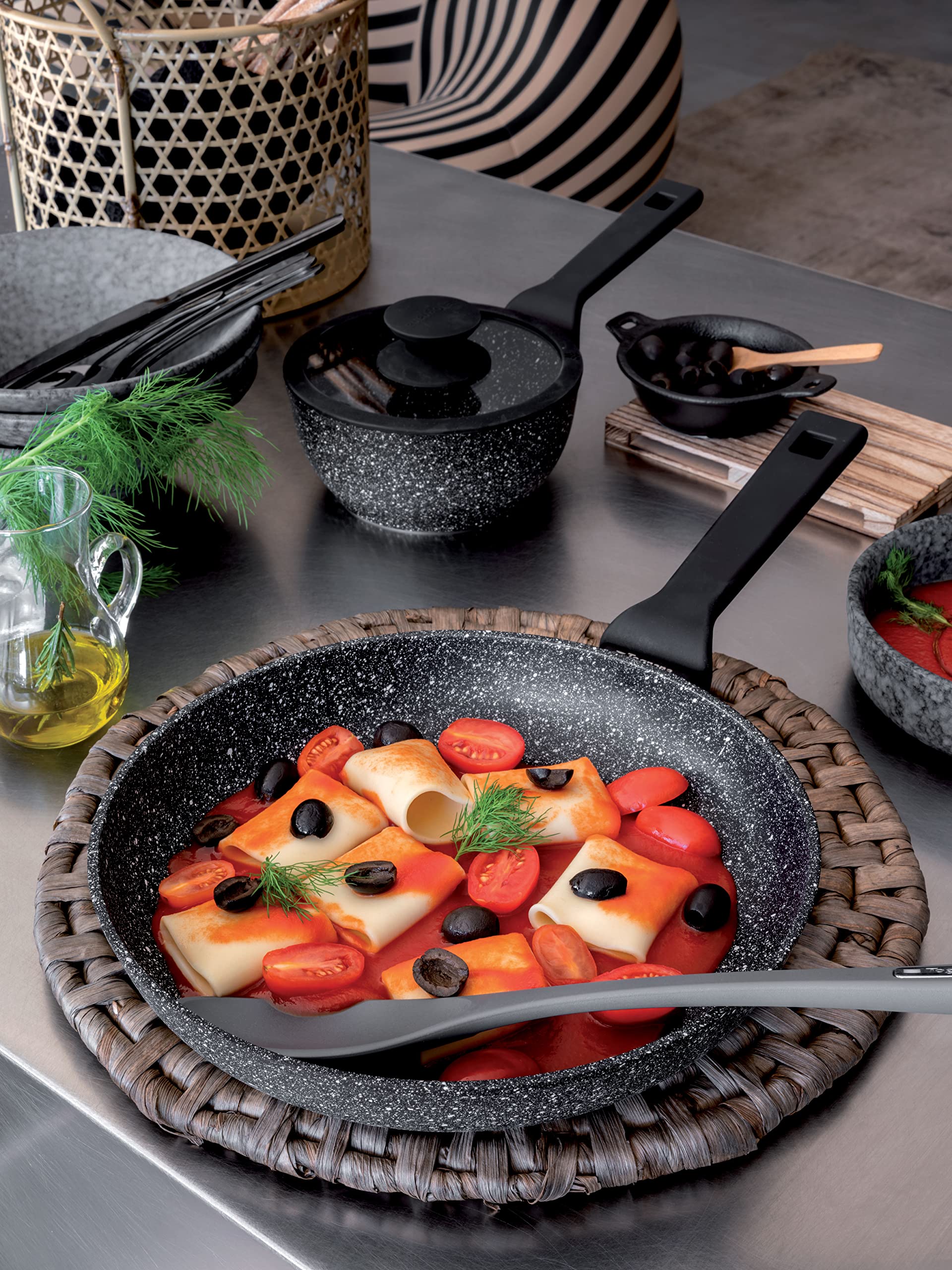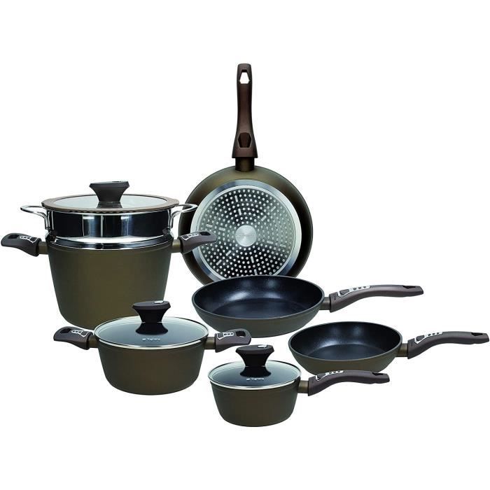 De Buyer Batterie de casseroles Inocuivre cuivre inox Tognana Ambiziosa Batterie, Aluminium moulé sous Corps en fonte d'aluminium renforcé avec des particules de titane, adapté à tous les types de plaques de cuisson et résistant au four... Batterie De Casseroles Tognana Copper & Charcoal, Et Poêles, 8 Pièces Avec 2 Poêles, 3 Casseroles, 3 Couvercles, Aluminium Noir Batterie Casserole La batterie 8 pièces de la ligne coppercharcoal, a un corps en aluminium imprimé et un revêtement intérieur antiadhésif à 3 couches qui garantit une cuisine saine et sans ajout de graisses. Il a un design minimaliste et esthétique très actuel, grâce à son revêtement extérieur en peinture silicone de couleur grise et est doté de poignées ergonomiques en bakélite peintes en teinte anti-brûlure et brûlures. Tognana Wild Stone, batterie de casseroles et Set complet de 8 pièces pour chaque besoin en cuisine: comprend des poêles de 24 cm et 28 cm, des casseroles avec... La batterie est composée de 8 pièces : 3 casseroles, 2 poêles et 3 couvercles de différentes tailles. Fond à haute épaisseur adapté également à l'induction Intérieur antiadhésif à 3 couches - pour une cuisine saine et sans graisse Extérieur en peinture silicone – robuste et résistant