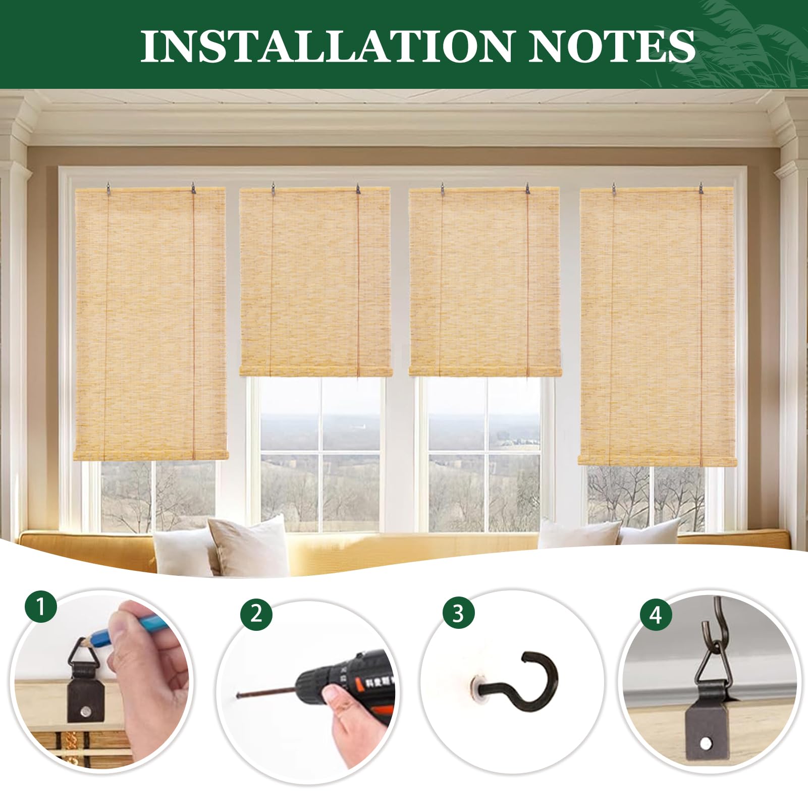 Essuyez les stores en bambou avec un chiffon sec ou humide pour les garder propres, ce qui facilite leur entretien Fixation Cordon Bois Rideau Bambou Exterieur Store Roseau Faciles à Installer Brise-Soleil Intimité 50 55 65 75 80 85 90 95 100 105 110 115 120 130 145 155 160 170 180cm De Large Pour Patio Jardin Cuisine Et Le Salon Installation Facile Sur Mesure Le rideau de roseau rétro naturel, seulement d'une exécution exquise, beau et pratique, avec une forte capacité décorative, peut être utilisé pour les espaces intérieurs et extérieurs, pour ajouter un charme unique à votre maisonNom du produit: stores en bambou/panneaux de clôture en roseaux/stores enrouleurs en bambou for l'extérieurMatériau du produit: roseau naturelFonction: pare-soleil, respirant, protection UV, protection de l'intimité, cloison, décorationEndroits appropriés: intérieurs et extérieurs, convient à tout endroit que vous souhaitez décorer et protéger du soleilTaille du produit: taille personnaliséeMéthode de fonctionnement: Tirez la corde vers la gauche for abaisser les storesTirez le cordon vers le bas for relever les storesTirez la corde vers la droite for fixer les storesMéthode de nettoyage: essuyer avec un chiffon sec ou humideLe paquet comprend:1 x store romain en bambou + accessoires d'installationMesure de la taille:Installation externe:Largeur des stores en bambou = largeur de la fenêtre + 15 cmHauteur des stores en bambou = hauteur de la fenêtre + 15 cmInstallation interne:Largeur des stores en bambou = largeur de la fenêtre - 1 cmHauteur des stores en bambou = hauteur de la fenêtreListe de colisage:1x store enrouleur en bambou + matériel de fixationRemarques:Nos stores enrouleurs en roseau sont mesurés manuellement, il y a donc une erreur d'environ 1 cm, Des erreurs de taille mineures faites à la main sont normalesEn raison de problèmes tels que l'éclairage et la photographie, l'objet réel peut avoir une légère différence de couleur par rapport à l'image, veuillez vous référer à la couleur réelle Ombrage et Protection de l'intimité: Le rideau de fenêtre en bambou réglable peut filtrer la lumière du soleil, offre une protection UV et une isolation thermique, vous protégeant ainsi du soleil brûlant de l'été et gardant la pièce fraîche De style rustique et vintage, très pratique, et convient à toutes les saisons Les stores vénitien occultant bambou peuvent être utilisés à fenêtre, toit, balcon, jardin, terrasses, salon, cuisine, la chambre à coucher, salle de bain, bureau, réunion, hôtel, patio, belvédère, restaurant, studio, galerie d'art, d'exposition, portes, porches, pergolas, salons thé, cafés, centres villégiature, salles peinture et etc Roller blind Rideau de Roseau Store Enrouleur Bambou,Rétro Romain... Les rétro rideau de roseau d'une qualité de fabrication exquise, d'un câblage régulier, et sont confortables au toucher, d'une belle apparence, d'un bon effet décoratif, faciles à entretenir. Stores à Rouleau En Roseau Naturel: Matériau naturel, tissé à la main. La corde est munie d'une perle en bois à l'extrémité, ce qui est agréable au toucher et facile à utiliser. Rétro Décoratif Stores en Bambou,90% Respirant Rideau de Roseau,Filtrage de la Lumière Stores Les stores enrouleurs en bambou sont méticuleusement tissés à la main à partir de roseaux naturels. Les stores à enroulement pour fenêtres sont équipés d'un dispositif de levage, vous pouvez ajuster la hauteur du store librement en tirant sur le cordon.