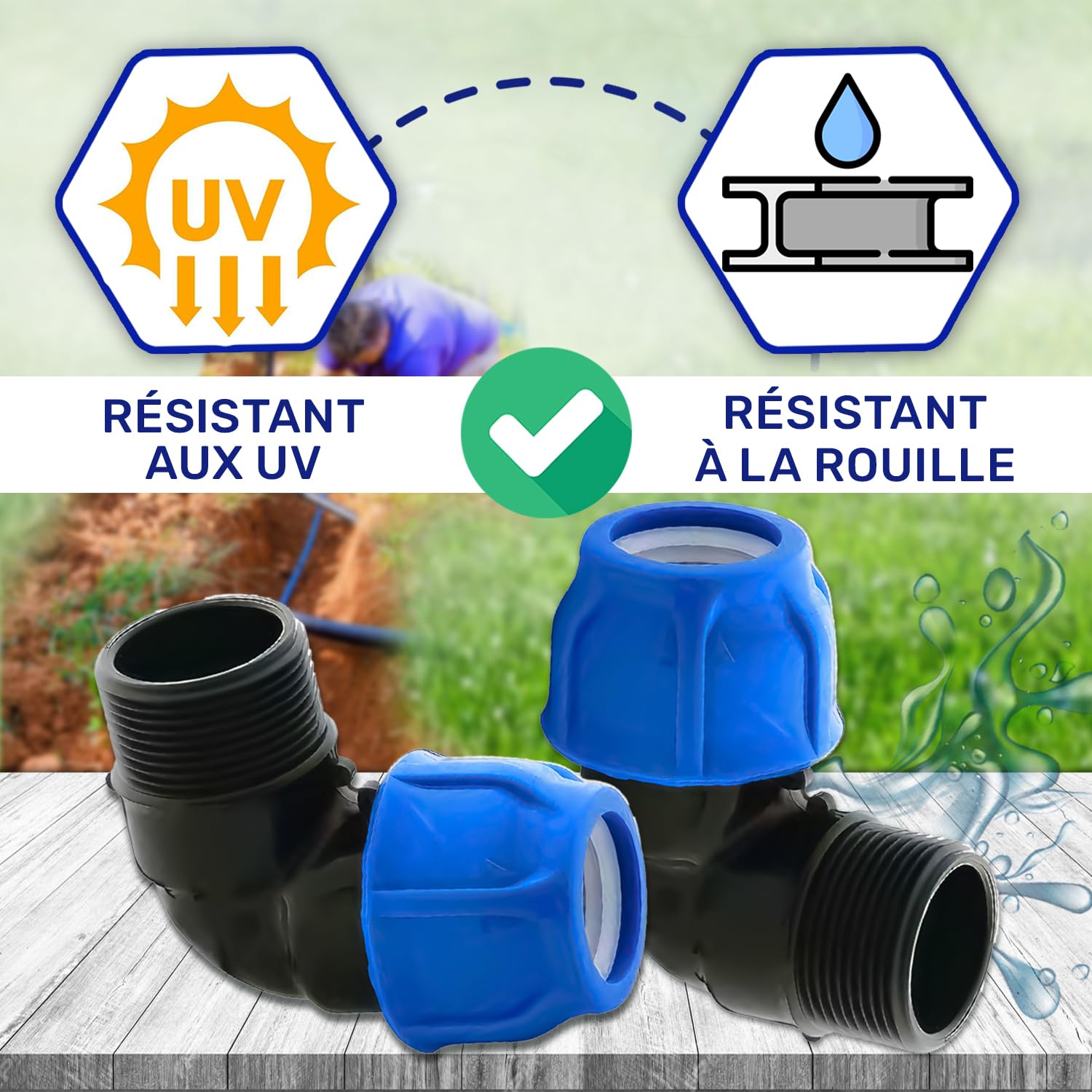 Raccord Coudé 90° 20 Mm 2 Pièces Raccord 25 Mm X 3/4″ Coudé 90° à Filetage Mâle En Polypropylène PP Pour Connexion De Tuyau Polyethylene PE - MONTERAL Connexion Irrigation Eau Potable Air Tuyau Polyéthylène Pour Plomberie Raccord En T Coudé 90° 20mm X 1 Diamètre des trous 20 mm. Conçu pour les systèmes haute pression PN16 MATÉRIAU - Raccord tuyau est fabriqué en polypropylène PP de haute qualité résistant aux chocs Conçu pour les systèmes haute pression PN16 MATÉRIAU - Raccord tuyau est fabriqué en polypropylène PP de haute qualité résistant aux chocs. Résistant à la rouille et corrosion chimique., Résistant aux UV. CARACTÉRISTIQUES PRINCIPALES - Raccord en T avec coudé 90° conçu pour raccorder des tuyau polyethylene PE. ASPECTS SPÉCIAUX DE L'INSTALLATION - Un serrage excessif de l'écrou pendant l'installation entraîne une contrainte supplémentaire sur l'adaptateur. Après l'installation, tester la pression du système avec de l'eau et vérifier l'absence de fuites DOMAINE D'APPLICATION - Le raccord peut être utilisé dans les systèmes d'approvisionnement en eau potable, les systèmes d'aménagement paysager, l'irrigation agricole, les systèmes d'air comprimé, les systèmes de plomberie et refroidissement Raccord tuyau 20 mm Raccord tuyau 20 mm : la sélection produits Leroy Merlin de ce vendredi au meilleur prix ! Retrouvez ci-après nos 231 offres, marques, références et promotions en stock prêtes à être livrées rapidement dans nos magasins les plus proches de chez vous