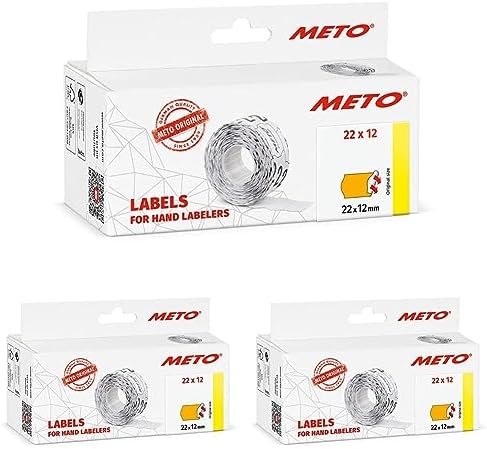 Adhésif : G5 permanent multi-usages et pour applications en chambres froides et en congélation. Vous aussi, faites confiance à l’original., Faites confiance à Meto. Rouleaux étiquettes METO 22x12mm 9000 étiquettes Jaune Vif, Pour étiqueteuse De Main 1 Lignes, Permanent, 26 X 12 Mm, 6 Rouleaux Etiqueteuse Manuelle Lot de 2x6000 étiquettes = 12000 au total. Adhésif permanent certifié contact alimentaire (ISEGA), papier blanc qualité supérieure. Format universel compatible avec la plupart des étiqueteuses manuelles (Meto, Contact, Sato, Avery...). Prédécoupage précis pour un fonctionnement fluide. Fabriqué en Allemagne, qualité fiable Les étiquettes pour étiqueteuses manuelles Meto conviennent pour l’étiquetage de prix, de la date, de n° d'articles, de n° de lots / colis, de plaques signalétiques, de matricules de salariés etc. La marque Meto est mondialement connue pour ses solutions d’étiquetage et de promotion des ventes de première qualité, destinées au secteur du commerce et à toute sa chaîne d’approvisionnement. Le papier résistant aux températures basses séduit par ses résultats d’impression clairs et réguliers sans maculer. Particulièrement adaptées à l’étiqueteuse manuelle METO Basic S. Étiquettes made in Germany, autorisées et certifiées pour le contact direct avec les denrées alimentaires Les étiquettes Meto sont la solution idéale pour marquer et identifier vos produits avec efficacité, partout où des informations précises sont requises. Résistant aux températures de -40°C à +60°C. L'adhésif haute performance de ces étiquettes est adapté et autorisé au contact direct avec les denrées alimentaires sèches, non grasses. 5 Rubans compatibles 91201 S0721610 pour Étiqueteuses Dymo Letratag Taille d’étiquettes 22 x 12 mm pour étiqueteuses 1 ligne, forme de l’étiquette : bord ondulé. 12 rouleaux d’étiquettes de 1 000 étiquettes chacun, total : 12 000 étiquettes. Les étiquettes munies de l’adhésif G5 sont particulièrement adaptées aux applications en milieux de réfrigération et de congélation. Brady™ Étiquettes en Tedlar auto-extinguibles à enrouler pour étiqueteuses M6/M7 Wrap Around