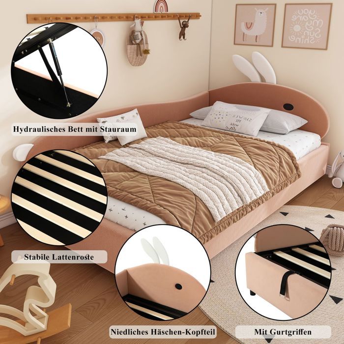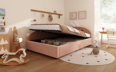 Tête de lit lapin mignonne et design adorable : La tête de lit en forme de petit lapin et la combinaison velours rouge brique clair + blanc apportent charme et douceur, séduisant les enfants et ajoutant une touche ludique à la décoration de la chambre. Type A+B Nombre de colis : 4 Capacité de charge : 150 kg Dimensions totales : 205 x 93,5 x 71 cm Lit Enfant 90x200 Merax Lit Enfant Polsterbett 180x200 Cm (2X 90x200 Cm), Tête Lapin, Rangement Hydraulique, Barrière Douce, Sans Matelas – Type C+D Lit Double 180x200 Cm Le cadre est-il interchangeable de gauche à droite ? Non Dimensions totales : 205 x 93,5 x 92 cm Sécurité et confort avec barrière douce surélevée : La barrière rembourrée entoure le lit pour protéger l’enfant pendant le sommeil ou le jeu. Les lattes solides assurent une surface stable et confortable pour un sommeil sain et sécurisé. Lit enfant - MERAX - 90x200 cm - Bois massif - Tête de lit en forme Matelas compatibles : (Matelas non inclus) 90 x 200 cm x 2 (épaisseur du matelas ≤ 20 cm) Lit rembourré, Lit enfant combiné, Lit hydraulique avec espace de rangement Type C Nombre de colis : 2 Pratique et facile à déplacer : Equipé de poignées de transport intégrées, ce lit double pour enfants est simple à déplacer ou réorganiser. Lit double combiné pour enfants : Ce Polsterbett unique réunit deux lits simples 90×200 cm pour créer un couchage double pratique, idéal pour partager ou organiser la chambre des enfants. Lit double combiné pour enfants : Ce Polsterbett unique réunit deux lits simples 90×200 cm pour créer un couchage double pratique, idéal pour partager ou organiser la chambre des enfants. Parfait pour gagner de l’espace et offrir un coin nuit confortable. Lit enfant 90x200 cm avec tête de lapin erax Lit rebourré, 160 x 200 c, hydraulique, lit Double avec soier... Type B Nombre de colis : 2 Type E Nombre de colis : 2 Type D Nombre de colis : 2 Type F Nombre de colis : 2 Rangement hydraulique spacieux : Grâce au système hydraulique, soulevez facilement le sommier pour accéder à un grand espace de rangement sous le lit. Type C+D Nombre de colis : 4