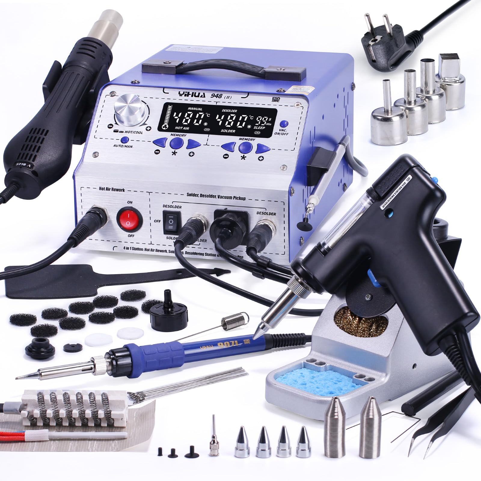 Accessoires améliorés : Les toutes nouvelles buses de fer a dessouder offrent une masse thermique 80 % supérieure à celle de notre buse de dessoudage de la génération précédente; une masse thermique plus élevée permet un retrait plus facile de la soudure nécessitant plus de chaleur ; comprend des buses de plusieurs tailles (0,8/1,0/1,2/2,0 mm) pour répondre aux besoins de dessoudage pour différentes tailles de joints Réduit l'usure inutile Étalonnage numérique de la température Étalonnage simplifié, sans calculs. Station de dessoudage haute puissance 110 W : Convient pour dessouder rapidement une variété de composants traversants ; par rapport aux pompe a dessouder standard et aux stations de dessoudage typiques de 60 W ou 80 W, cette station de dessoudage est plus capable de dessouder les circuits imprimés multicouches que l'on trouve couramment sur les cartes mères (Remarque : ce modèle ne convient pas pour dessouder les cartes mères de cartes graphiques., ) Contrôle précis de la température et utilisation facile : température réglable de 380 °C à 480 °C ;Station de soudage à programme PID intégré permet une régulation rapide et précise de la température. Elle offre un dessoudage plus propre, sans résidus, en continu et offre une efficacité accrue. Différents choix de buses : 0,8/1,0/1,2/2,0 mm Pourquoi choisir YIHUA 948D-I ? Comparée aux pompes à dessouder et aux stations de dessoudage standard de 60 W, la YIHUA 948D-I traite non seulement facilement les composants traversants, mais excelle également dans le retrait des composants des circuits imprimés multicouches. Description du produit YIHUA 948D-I 110W Station de dessoudage Cette station de dessoudage est adaptée au dessoudage de divers composants traversants et permet un dessoudage continu sans entretien fréquent de débouchage. Intervalle de compensation PID : Toutes les 20 ms Choisissez YIHUA en Toute Confiance : Conçu pour une tension de 230V AC avec une prise électrique de type F pour l'UE, ce produit est accompagné de notre couverture technique exclusive de 12 mois pour l'UE. Station à dessouder YIHUA 948, 80 W, avec arrêt automatique Réduit les risques en cas d'inactivité, Sécurité améliorée Anpassung an unterschiedliche Arbeitshöhen 3 canaux préréglés : chaque canal préréglé peut être désigné avec une température spécifique définie par l'utilisateur ; la station de dessoudage permet de passer d'un simple bouton aux paramètres couramment utilisés sans avoir à régler la température à plusieurs reprises pour différentes tâches Station de soudage et dessoudage ERSA i-CON VARIO 4 – avec i-TOOL AIR S... Mode sommeil et veille automatique : lorsque le pistolet à dessouder est inactif pendant une durée supérieure à la durée définie (réglable de 0 à 120 minutes), la station de dessoudage entre en mode veille pour aider à réduire l'usure inutile et prolonger la durée de vie de la buse et de l'élément chauffant ; une non-utilisation supplémentaire pendant 30 minutes déclenchera le mode veille pour empêcher un fonctionnement sans surveillance et améliorer la sécurité Contenu de la boîte : 1*YIHUA 948D-I station de dessoudage, 3 buses de dessoudage supplémentaires (0,8/1,2/2,0 mm, 1*buse de 1,0 mm par défaut sur le pistolet à dessouder) ; 5*filtres absorbants ; 2*filtres en céramique ; 1*jeu de broches de nettoyage ; 2*ressorts de filtre ; 1*chambre à résidus de soudure (transparente) ; 1*support de pistolet à dessouder ; 1*tampon résistant à la chaleur ; 1*tampon d'étanchéité en silicone pour pistolet à dessouder ; 1*couvercle de prise sous vide. Tube de filtre remplaçable YIHUA 948D-I Station De Dessoudage 110 W Haute Performance Dessoudeuse 110W YIHUA 853AAA Station de soudage à air chaud SD Enseble de station de... Prolonge la durée de vie de l'élément chauffant Réduire l'augmentation de la charge et réduire les charges utiles Écran inclinable Anpassung an verschiedene Betrachtungswinkel Jeu complet de filtres 3 canaux prédéfinis Enregistrement et accès à 3 réglages de température prédéfinis Accessoires remplaçables Ressort de filtre remplaçable Mode sommeille 0 à 120 min réglable