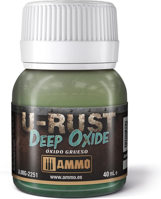 A.Mig 2256 U-Rust Oxide Grime 40ml Product formulated to create real black oxide. Ideal for simulating dark oxidation zones and fantasy scenarios. Provided in a convenient 40 ml (1.35 fl oz) container. Compatible with the entire U-Rust range A.MIG 2256 U-Rust Oxide Grime AMMO Of Mig Jimenez -2256 Produit U-RUST AMMO MIG pour la rouille