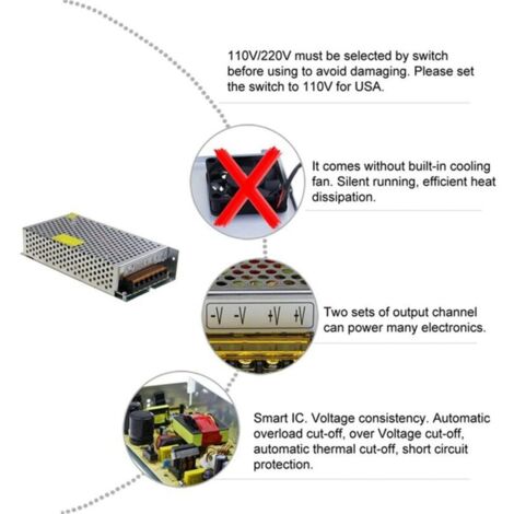 Alimentation LED Imprimante 3D AC110V-220V à DC24V 15A Transformateur Alimentation à Découpage Convertisseur AC/DC 110V 220V 12V 15A 180W keskeny kivitelű hálózati tápegység AC-DC LED lámpa ac 220v à dc 12v 15a 180w alimentation alimentation transformateur... Il n'y a pas de ventilateur à l'intérieur boîtier et il fonctionne silencieusement. Entrée : 110 V/220 V CA ; Cohérence de tension : il n'y a pas de fluctuation de tension pendant la mise sous tension, la transmission, la réception, l'arrêt. Dawafit Couleur :Comme illustréMatériau :MétalContenu de l' :1 alimentation 12 V 15 ASeul le paquet ci-dessus, les produits ne sont pas inclus. Caractéristiques de sécurité : coupure automatique de surcharge, coupure de surtension, coupure thermique automatique, protection contre les courts-circuits. pour les bandes LED, les imprimantes 3D, les émetteurs-récepteurs radioamateurs, les caméras de vidéosurveillance, les amplificateurs de caisson de basses de voiture, les amplificateurs audio, les routeurs , les ADSL, les HUB, les alimentations audio/vidéo. Utilisation en intérieur uniquement ! Il n'y a pas de ventilateur à l'intérieur du boîtier et il fonctionne silencieusement. Le boîtier en métal comporte de nombreux trous pour rendre la dissipation de la chaleur plus efficace