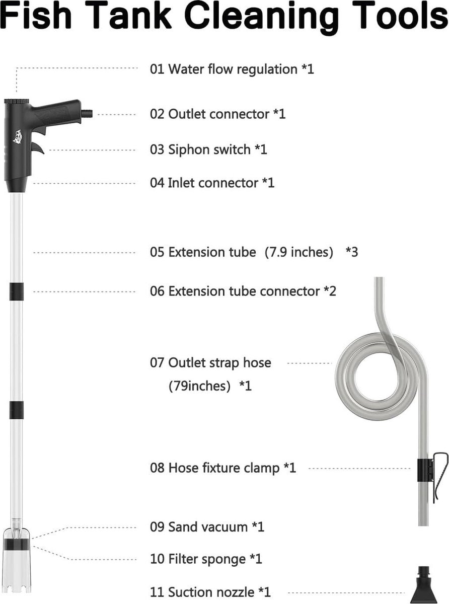 Matériaux de haute qualité : Siphon aquarium est fabriqué en ABS de haute qualité, il est écologique et non toxique et n'altère ni la qualité de l'eau ni la santé des poissons. Une pression sept fois sur la poignée permet d'atteindre la puissance d'aspiration maximale. Spécifications : Couleur : noir Nécessite des piles : non Matériau : ABS, PVC Contenu de la livraison : 1× aspirateur pour aquarium, 2× tubes d'extension (40 cm) 1× collier de serrage 1× régulateur de débit d'eau 1× tuyau (2 m) 1× raccord de tuyau 1× raclette en verre Mode d'emploi 1., Préparatifs : vérifiez toutes les pièces du kit : poignée, tube d'extension, accessoires et tuyau. Le grattoir à algues élimine les algues et la saleté des parois de l'aquarium, permettant ainsi de changer l'eau et de nettoyer simultanément. Préparez un seau pour recueillir les eaux usées., 2., Assemblage : assemblez l'aspirateur de fond pour aquarium. Permet de nettoyer le sable et vider l'aquarium avec l'accessoire rejet (tuyau non fourni). Il est livré avec 2 filtres et 1 sortie pour raccorder un tuyau De nombreuses possibilités d'utilisation : L'accessoire de nettoyage pour aquarium est équipé de deux tuyaux d'extension et convient aux aquariums de plus de 40 cm de long. Appareil multifonction 4 en 1: Cet nettoyage aquarium combine le changement d'eau, l'élimination des débris, le nettoyage du substrat et le nettoyage des vitres en un seul appareil. L'aspirateur est équipé de deux tubes d'extension pouvant atteindre 40 cm de long et convient à toutes les tailles d'aquariums. Aspirateur Pour Aquarium AFLY Aspirateur De Gravier Pour Aquarium,Nettoyant Efficace Pour Gr Daquarium Outils De Nettoyage Manuels De Siphon D Amz B0 Aspirateur Aquarium 4 En 1 Minifinker Siphon Aquarium Nettoyeur Gravier Pompe à Eau à Main pour... Vous pouvez ainsi éliminer facilement l'eau sale et les impuretés du fond de l'aquarium. Facile à utiliser : Aucune alimentation électrique n'est nécessaire. Le tuyau d'aspiration et le tuyau flexible sont résistants à la corrosion et durables, et offrent une sécurité fiable pour le nettoyage de votre aquarium. Assure un environnement de vie propre et confortable dans l'aquarium. NICREW 2 en 1 Aquarium Changeur d'eau, Kit de Aspirateur Aquarium avec Il suffit de tenir fermement la poignée et d'appuyer sept fois pour obtenir une puissance d'aspiration maximale. Réglez la puissance d'aspiration à l'aide du régulateur de débit. Conservez le kit dans un endroit sec et vérifiez régulièrement que le panier du filtre n'est pas bouché afin de prolonger sa durée de vie., Remarque : 1., Veuillez nettoyer régulièrement l'intérieur des déchets., 2., Lors du raccordement des tuyaux, vérifiez qu'il n'y a pas de fuite de gaz., 3., Lors du pompage, la sortie doit se trouver en dessous de l'entrée. Assurez-vous que le raccord est bien serré afin d'éviter toute fuite., 3., Mise en service : plongez le tuyau d'alimentation dans l'eau et appuyez plusieurs fois sur la poignée jusqu'à ce que l'eau s'écoule.