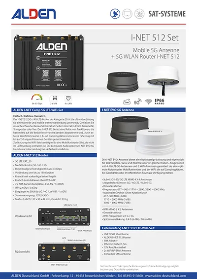 Lecteurs SIM : Équipé de 2 lecteurs SIM, ce qui permet une flexibilité maximale dans le choix de votre opérateur mobile (carte SIM Starter en option). Alden Routerset I NET CAMP 512 | Campingzubehör Alimentation : Fonctionne sur une tension d'alimentation de 12V (plage de 9-50V), idéal pour une utilisation en déplacement. Grâce à sa technologie avancée 5G et LTE Cat 20, ce routeur garantit des vitesses optimales pour répondre aux exigences des utilisateurs les plus connectés. Routeur 5G LTE ALDEN PACK 4G TV Smart 19" + / 5G Ready + Routeur I-NET Antenne I-NET 4G Connectique : 4 ports LAN RJ45 et 1 port WAN pour une connectivité filaire stable. Le Pack I-NET 512 5G/4G LTE d'Alden représente la solution idéale pour les voyageurs en quête d'une connectivité Internet fiable et rapide, où qu'ils soient. Mode répéteur Hotspot WiFi : Fonctionnalité permettant de créer un point d'accès WiFi en 2., 4GHz et 5GHz pour partager la connexion avec plusieurs appareils. Sécurité : Comprend des règles de firewall préconfigurées et une prévention contre les attaques DDoS, garantissant la sécurité de votre réseau. Dimensions : Antenne robuste avec des dimensions de 189 x 182 x 85 mm et un poids de 940 g, facilitant l'installation sur votre véhicule. Avec la capacité de connecter jusqu'à 150 appareils simultanément, il est parfait pour les familles ou les groupes d'amis voyageant ensemble dans un camping-car ou un van. Caractéristiques : I-NET 512 ROUTER 5G/4G-LTE Cat. Alden AS2@ 60 HD Platinium sistema de satélite totalmente automático... Ce routeur performant permet de se connecter à Internet en déplacement, garantissant une expérience de navigation fluide, même dans des zones éloignées. connexion rapide et stable ALDEN I-NET Antenne 4G LTE + Routeur - Internet Wifi Camping-car Fourgon Van