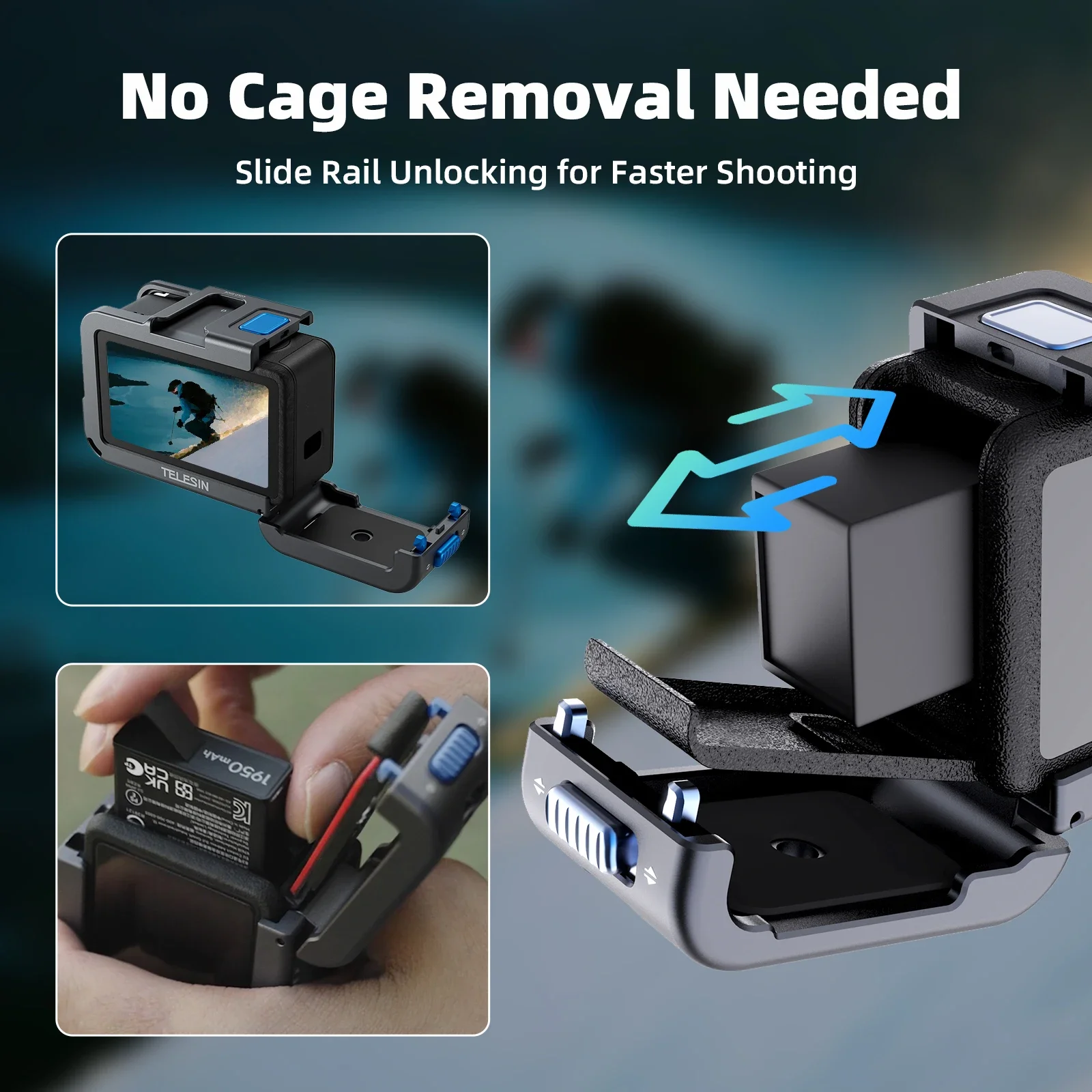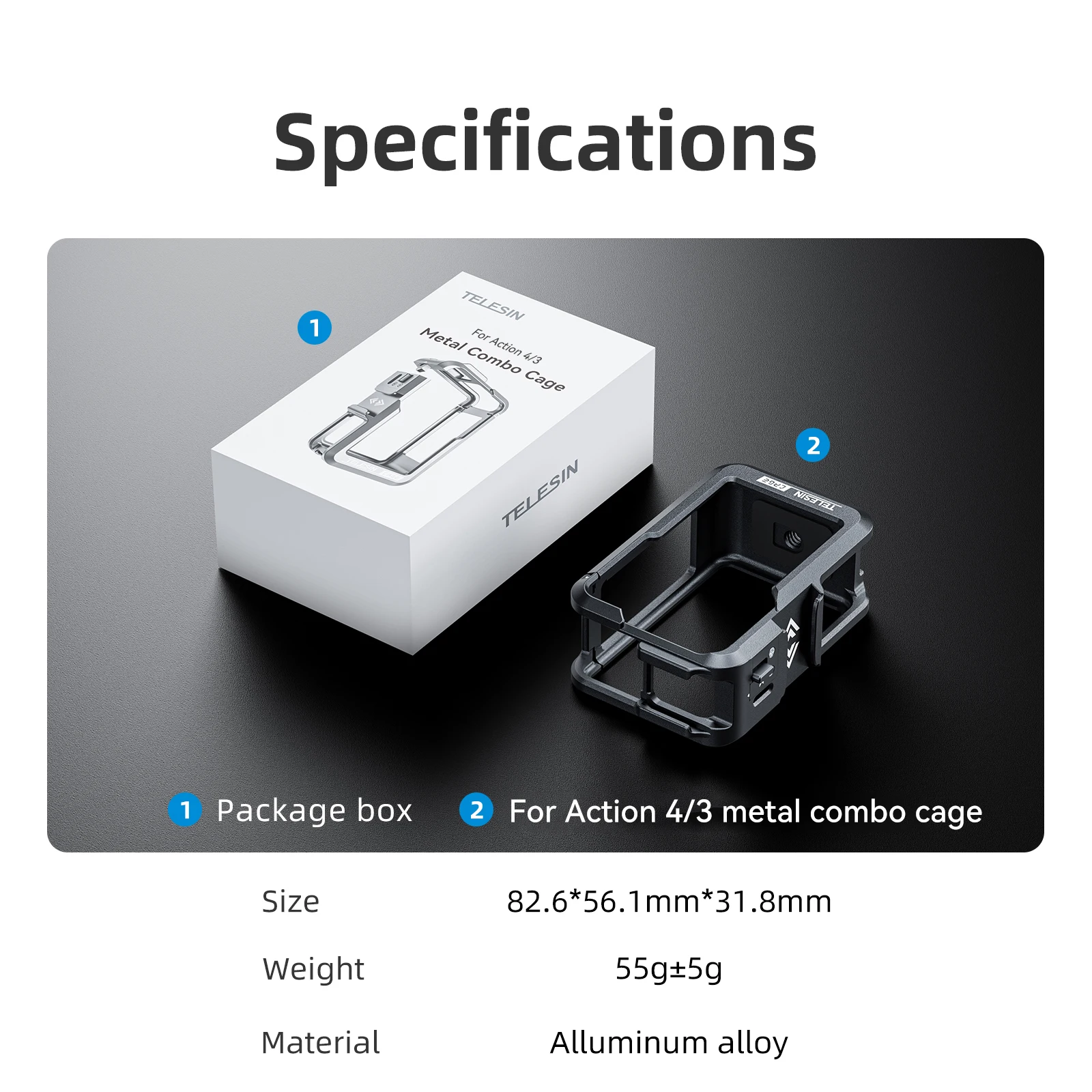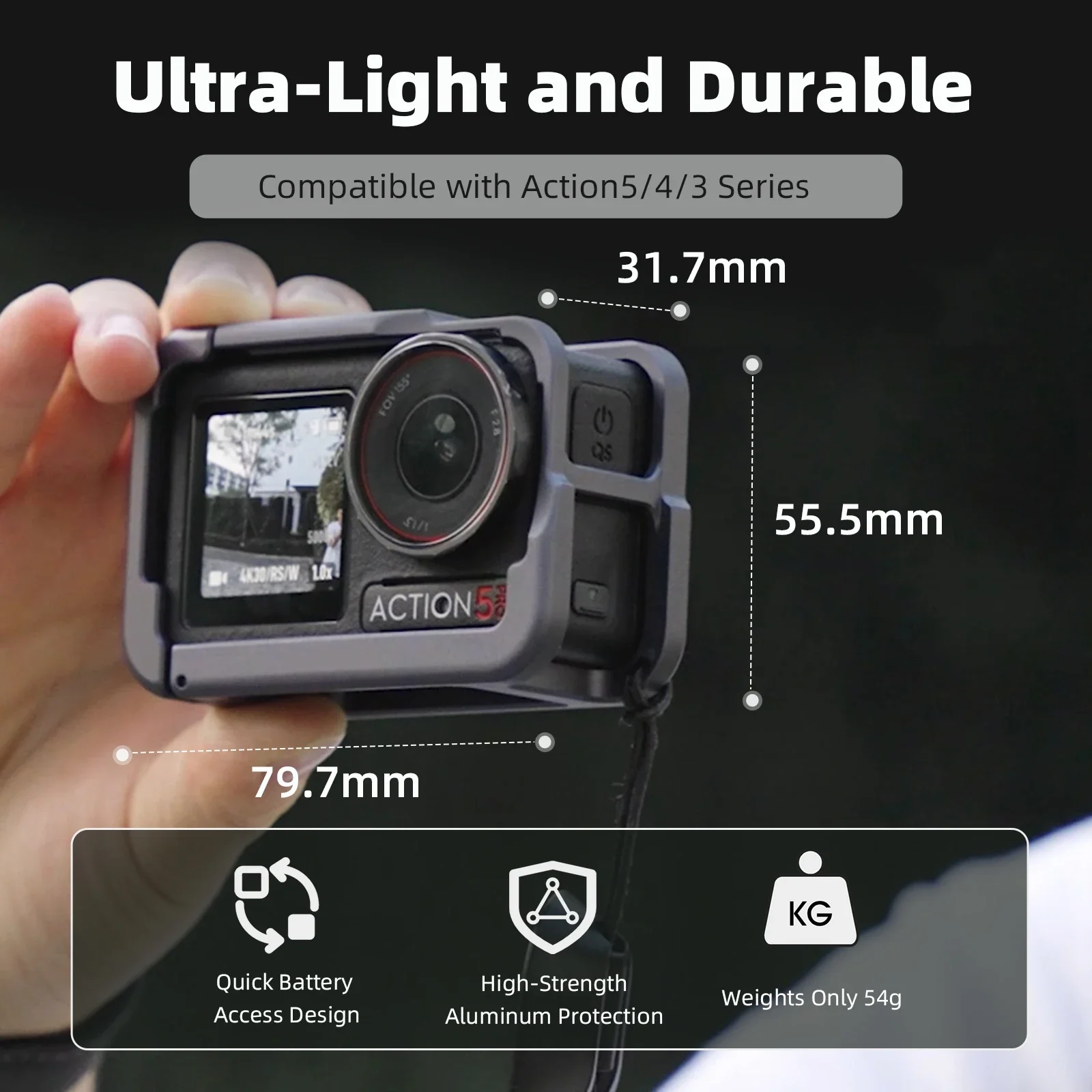 TELESIN Kamerakäfig für DJI Osmo Action 4 Action 3, Aluminium Schutzkäfig gehäuse käfig für DJI Get the DJI Action Pro 5 as part of the Adventure Bundle at its best... Cage Légère Action Caméra Dji Accessories TELESIN Lens Filter Set For DJI Action 5 Pro Action 4 Action 3 Camera Accessories, 4 Dji Action 5 Pro Nd Filter Montage Sabot Froid 1/4 Pour Micro TELESIN Boîtier en aluminium ultra léger pour appareil photo TELESIN Action 5 Pro, Action 4, Action 3 Description du produit : Améliorez votre expérience de prise de vue en plein air avec le boîtier en aluminium ultra léger TELESIN méticuleusement conçu pour DJI Action 5 Pro, Action 4 et Action 3., Fabriquée avec précision en utilisant un moulage par injection CNC en alliage d'aluminium, cette cage pour appareil photo offre une portabilité et une facilité d'installation inégalées, pesant seulement 54 grammes. Compatibilité améliorée de l'objectif : cette cage de caméra se distingue par sa capacité à accueillir des filtres d'objectif ND et CPL, offrant une flexibilité lors de la prise de vue en plein air tout en protégeant à la fois le métal nu et les composants de l'appareil photo. TELESIN Kaerakäfig für DJI Action 5 Pro Oso Action 4 Action 3... Caractéristiques principales : Design ultra léger : avec seulement 54 grammes, la cage métallique TELESIN OA5/4/3 est fabriquée avec précision en utilisant un moulage par injection CNC en alliage d'aluminium amélioré, assurant une portabilité sans effort et une facilité d'installation. Options de montage polyvalentes : équipée d'un support de griffe et d'un trou de vis de 6,35 mm, cette cage pour appareil photo est compatible avec n'importe quel trépied ou monopode de 6,35 mm. Compatibilité améliorée de l'objectif : cette cage de caméra se distingue par sa capacité à accueillir des filtres d'objectif ND et CPL, offrant une flexibilité lors de la prise de vue en plein air tout en protégeant à la fois le métal nu et les composants de l'appareil photo Accès pratique et sécurité : la découpe latérale assure un accès facile au port de charge et à la fente pour carte SD.