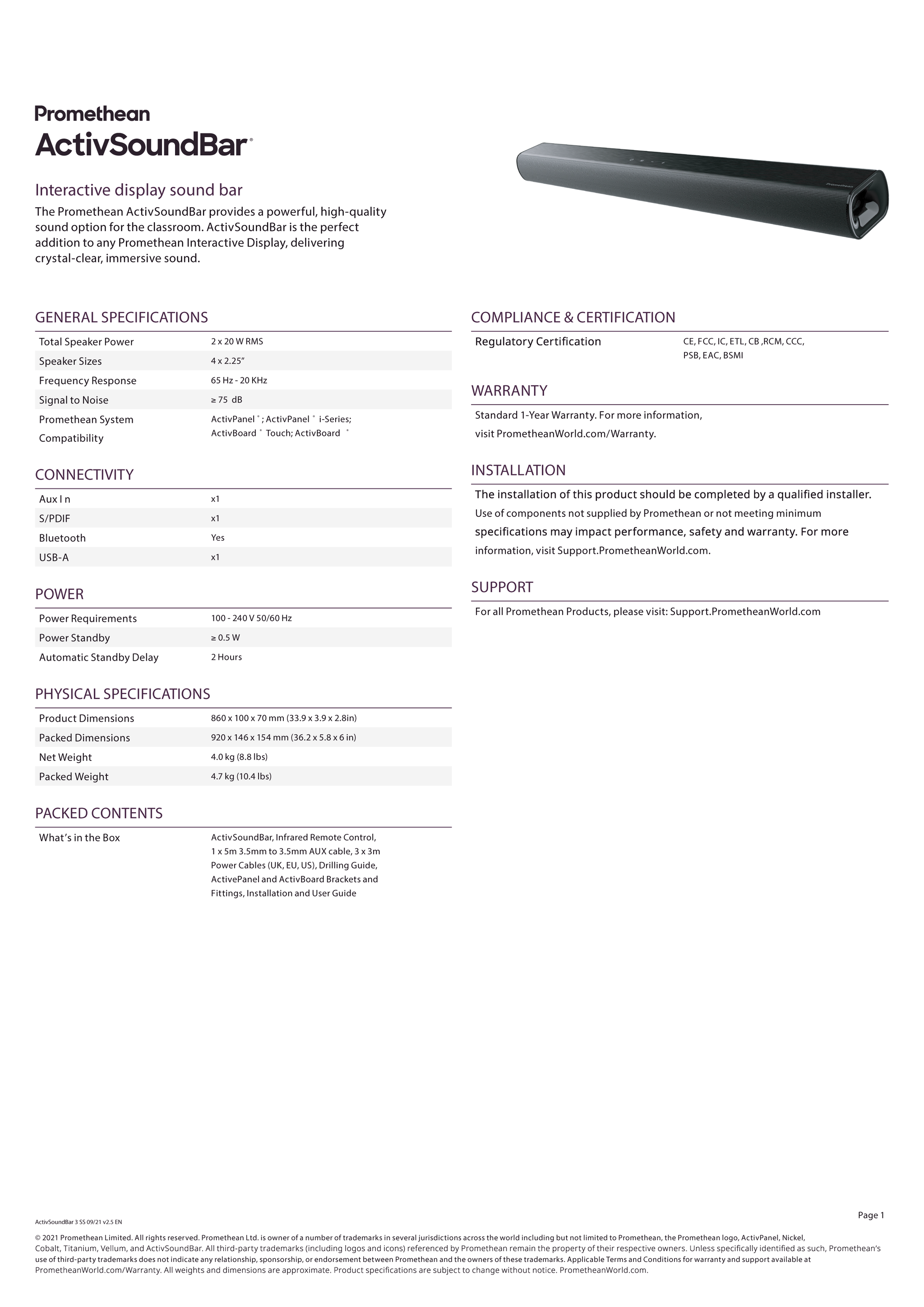 Soundbar ActivSoundBar (Gebraucht) in für CHF 50 - nur Abholung auf Promethean - AV et photo 4335., 0000 kg , Fabricant : Enceinte Tableau Blanc Interactif Promethean ActivSoundBar 3 Für AB10T Und Alle ActivPanels - Beamer Barre De Son Promethean L'ActivSoundBar est une enceinte externe de haute qualité s'intégrant sur les solutions interactives Promethean. Devis en ligne, formation, assistance et démos gratuites Promethean ActivSoundBar - Soundbar - för interaktiv whiteboard - 40...