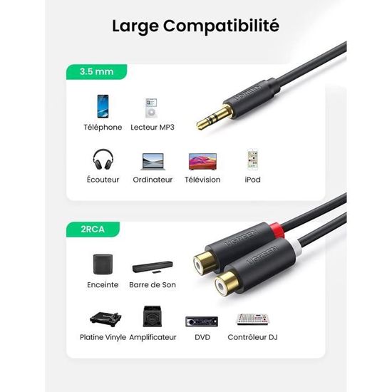 Il résiste aux pliures et torsions tout en maintenant une performance stable pendant de longues périodes. Il permet de transmettre l'audio en stéréo à travers les entrées gauche et droite, garantissant un son de qualité supérieure. Cela minimise la perte de signal et garantit un son pur, clair et sans interférences, pour une expérience d'écoute de qualité. Pour une utilisation encore plus pratique, le câble dispose d'un design biseauté et cranté qui permet une connexion sécurisée, tout en garantissant une manipulation facile. Ugreen - câble stéréo Jack 3.5mm vers 2RCA Y, cordon adaptateur pour haut-parleu Compatibilité Universelle et Pratique: Il fonctionne avec les appareils audio standard dotés d'une prise jack 3,5mm, tels que des casques, des écouteurs, des tablettes, et des smartphones. Le câble est fabriqué avec des matériaux de haute qualité, incluant un double blindage qui protège contre les interférences électromagnétiques, garantissant une expérience sonore sans perturbations. Câble adaptateur audio AUX, avec design métallique fin, transmet un son clair depuis votre smartphone, ordinateur portable, système home cinéma vers... Le revêtement extérieur en PVC rend le câble flexible, durable et résistant aux contraintes de l'utilisation quotidienne, tout en prévenant les dommages aux connecteurs. Il permet de connecter tous vos appareils portables dotés d'une prise jack 3,5mm à des systèmes audio externes tels que des récepteurs stéréo, des amplificateurs ou des haut-parleurs. Construction de Haute Qualité pour une Transmission Claire: Le câble est conçu avec un double blindage, des connecteurs métalliques polis et un connecteur plaqué or 3,5mm, offrant une résistance à la corrosion. Jack Rca Câble Adaptateur Audio Auxiliaire 3,5 Vers 2 RCA Pour Amplificateurs Adaptateur Jack 3.5mm RCA VOITURE 5.0 MAINS-LIBRES Auxiliaire Audio Câble Adaptateur Pour EUR 22... Design Pratique et Robuste: Le design biseauté et cranté des connecteurs assure une connexion sécurisée et stable.