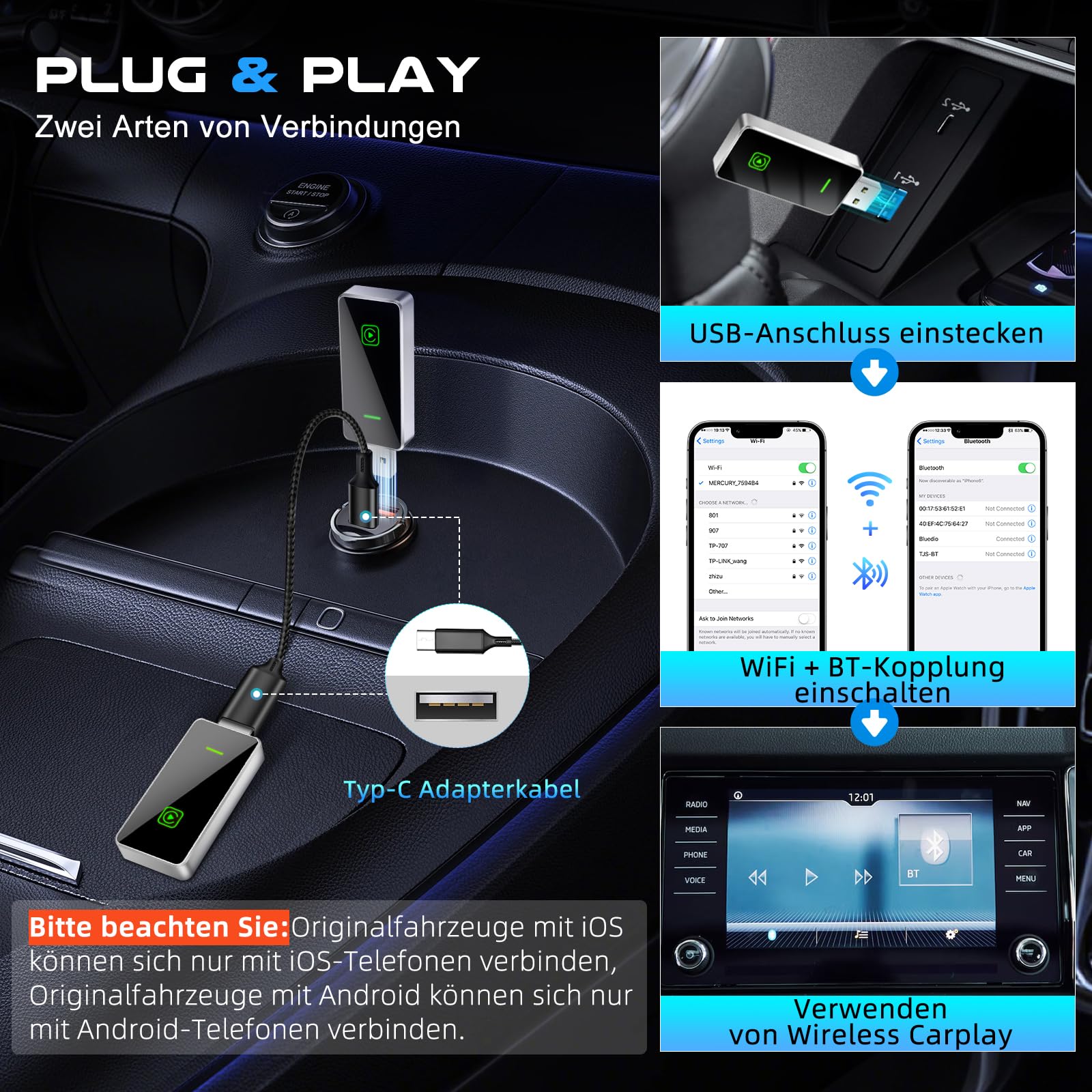 Il ne fonctionne qu'avec les téléphones mobiles dotés d'iOS 10 ou d'une version plus récente. Après la première connexion, il se reconnecte automatiquement même si votre téléphone est dans votre poche, votre sac à dos ou à l'extérieur de la voiture. Notre adaptateur carplay sans fil est sans aucun doute le meilleur choix 【COMPATIBILITÉ】L'adaptateur USB CarPlay sans fil est compatible avec plus de 800 modèles de voitures. Les meilleurs adaptateurs sans fil CarPlay pour conduire en 【PLUG & PLAY】L'adaptateur CarPlay sans fil nécessite 3 étapes de configuration simples, sans besoin de pilotes supplémentaires, d'applications ou de mises à jour système compliquées. Vous permet d'utiliser l'application Carplay complète et de continuer à faire fonctionner les choses comme d'habitude. Adaptateur CarPlay sans Fil, Convertit Le Câble d'Usine en Dongle CarPlay sans Fil, Plug & Play pour iOS 10 et Voitures de 2019 , Contrôle Vocal Intelligent... 【PROFESSIONAL TECHNICAL SUPPORT】Ce produit n'est pas disponible pour les voitures avec le système d'exploitation Android. Prend en charge la navigation, la lecture de musique, l'assistant Siri, les appels téléphoniques, les messages texte et plus encore. L'expérience globale est plus fluide, plus silencieuse et sans latence. Wired To Wireless Adaptateur Sans Fil CarPlay Pour IPhone,2024 Mise à Niveau Convertit L'usine Câblée En Dongle Carplay Sans Fil Pour Un Contrôle Sans Fil Plug&Play, Carplay Adapté Aux Voitures 2017+et Aux IPhone IOS10 Cle Wifi Compatible avec iPhone iOS 12 et plus récent (iPhone 6 minimum). Navigation GPS, musique, appels mains libres, commande Siri - tout fonctionne parfaitement 【SMART EXPERIENCE】This wireless carplay adapter utilise une puce intelligente et un processeur puissant pour fournir une connexion sans fil rapide et stable, réduisant les interruptions et les retards pendant l'utilisation.