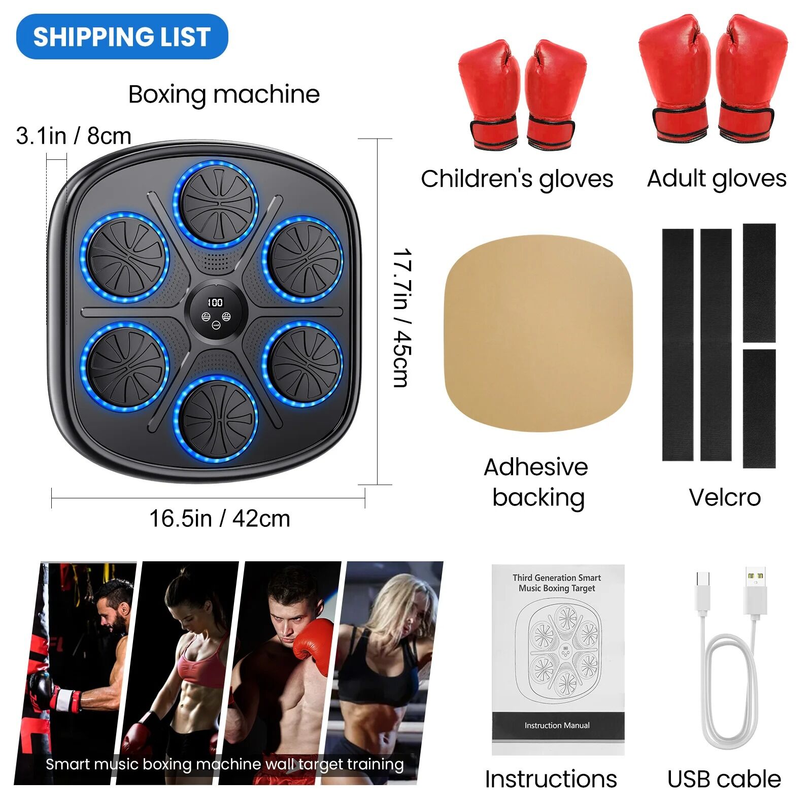 Aucune perceuse nécessaire. L’intensité et le style se règlent via le panneau tactile selon ton niveau ou celui d’autres utilisateurs. Appareil Fitness LED Réactif EZERO Machine Beatpunch Boxe Adulte Avec Bluetooth & LED Machine De Boxe Musicale Beatpunch Machine de Boxe Musicale Adulte Beatpunch Machine Boxe Mural Musique... Faut-il que la machine soit branchée ? Non, elle est équipée d’une batterie rechargeable avec un câble USB (1,5 m). Des lumières interactives et un rythme stimulant transforment chaque séance en entraînement motivant Utilisable également sans son ; les lumières LED indiquent les frappes et le temps d'entraînement. Set complet pour entraînement boxe - En plus de la machine de boxe, recevez gants, corde, serviette, bandes de fitness et sac de transport – tout le nécessaire pour un entrainement boxe efficace à la maison. Une charge dure 6 à 8 heures. Transforme tout espace en zone d’entraînement grâce à son design compact. Beat Punch Adulte interactif - Profitez de la technologie beat punch adulte, qui associe musique et LED pour un entraînement rythmé et immersif, tout en travaillant les bras, les poings et le haut du corps. Puis-je m'entraîner avec ou sans musique ? Oui, via Bluetooth et haut-parleur intégré. Machine de Boxe Musicale Édition Limitée Rose Utilisable sans câbles visibles, n’importe où. Parfait pour femmes et familles - La beatpunch boxe femme et la machine de boxe musicale enfant rendent le produit polyvalent et sécurisé, idéal après une journée de travail ou pour une activité familiale le week-end. Quels accessoires sont inclus dans le paquet ? Comprend : machine de boxe, gants MMA, corde à sauter, 5 bandes, chiffon en microfibre, sac, câble USB de 1,5 m et bande adhésive industrielle. Machine de boxe à musique intelligente, Bluetooth Beat Punch, cible murale, sac de sable 4.2 par LED, équipement d'entraînement de boxe, salle de sport à domicile