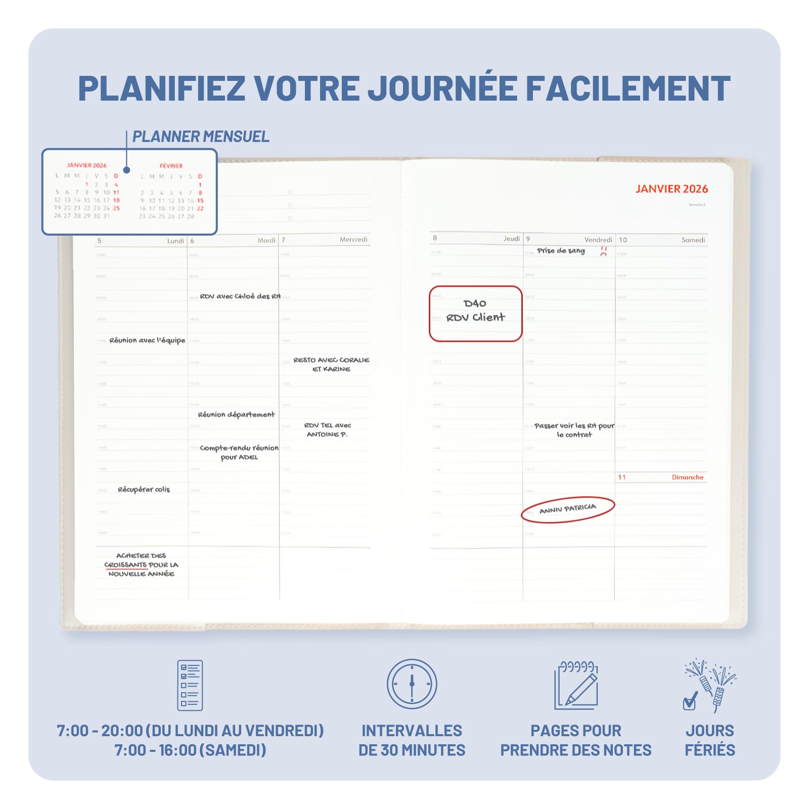 Il allie élégance et simplicité grâce à sa couverture souple en simili cuir. Kokonote Agenda 2026 Grupo Erik - Agenda 2025 Seainier Professionnel A4 | Carnet De Rendez Agenda Semainier 2026 De plus, il reste bien à plat une fois ouvert, vous pouvez donc le garder près de vous pour toujours avoir sous les yeux les choses importantes Il possède 200 pages de 120g. De plus, il allie élégance et simplicité grâce à sa couverture souple en simili cuir. Il possède également 2 rubans marque-pages et 2 pochettes à l'intérieur des couvertures. Grand carnet Toile de Jouy, bleu Il a une semaine sur deux pages et possède un format vertical. Il contient : un calendrier de 2026 et 2027, un planning de 2026 et 2027, un planning mensuel et des pages pour gérer vos finances au début de chaque mois, les jours fériés et des pages pour prendre des notes. Son grand format A4 est idéal pour que vous puissiez l'utiliser comme agenda de bureau ou carnet de rendez-vous., Mesure 21 x 29,7 cm. AGENDA ANNUEL 2026 - Cet agenda semainier couvre l'année 2026 et possède les mois de décembre 2025 et janvier 2027 en bonus. CONTENU BONUS - L'agenda contient également : des pages pour gérer votre budget, les jours fériés, les numéros des semaines, un espace pour prendre des notes chaque semaine, un calendrier de l'année 2026 et 2027 et des pages pour prendre des notes Exacopta - 22822E - Recharge agenda de bureau Eurotie 22S spiralé... Grupo Erik - Agenda 2025 Seainier Professionnel A4 | Carnet de Rendez... Il va de décembre 2025 à janvier 2027 inclus. Chaque jour est découpé en tranches horaires de 30 minutes. Il possède également deux rubans marque-pages, ainsi que deux emplacements où vous pourrez mettre des notes à l'intérieur des couvertures. L'année 2026 est à nos portes, et avec elle, une multitude d'opportunités à saisir et de projets à concrétiser.