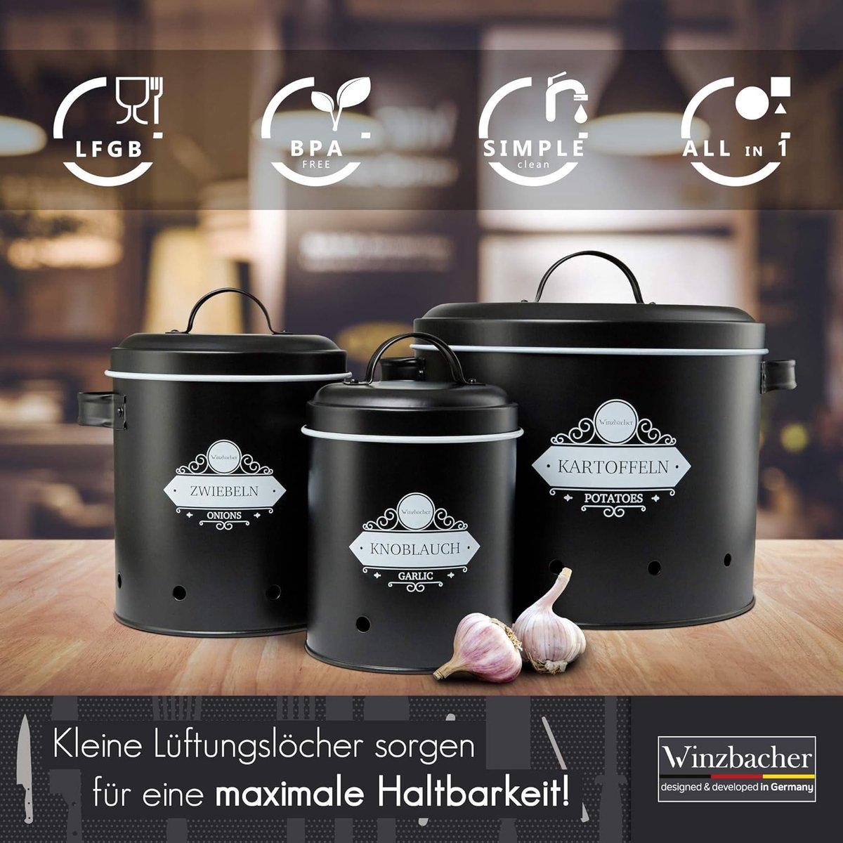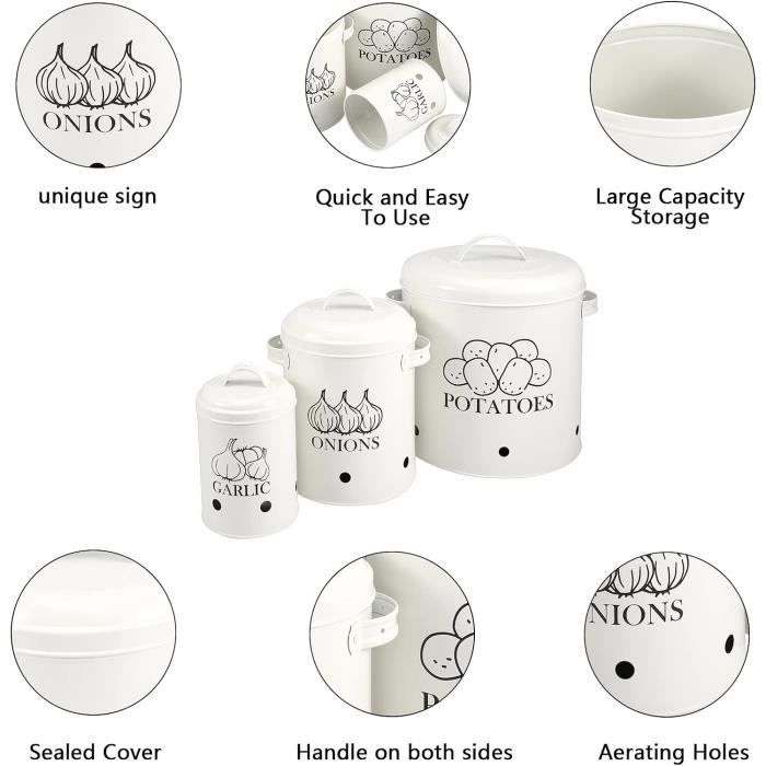 24 x 23 x 15,5 cm, env. 300 g- Matériau : fer, bambou, silicone- Disponible en différentes couleursBoîtes à pommes de terre carrées en métal- lot de 3 pour le stockage des pommes de terre, des oignons et de l'ail- Le stockage dans un endroit sec et sombre empêche la formation de germes- Les trous d'aération au fond assurent une bonne circulation de l'air- Conditions de conservation optimales pour une durée de conservation prolongée- Avec des poignées pratiques pour un transport facile - Couvercle avec poignée- Design décoratif avec imprimé et couvercle en bambou pour un aspect esthétiqueContenu de livraison- 1x boîte de conservation pour pommes de terre- 1x boîte de conservation pour oignons- 1x boîte de conservation pour l'ail- Livraison sans objets de décoration Design : bacs à pommes de terre carrés en blanc mat - Motif décoratif - Atout pour la cuisine De cette manière, les aliments restent frais longtemps. ARTECSIS Lot de 2 Boîte Pomme de Terre 5L Rouge/Blanc - Rangement 15 x 11 x 11 cm, env. Les trous d'aération au fond assurent une circulation optimale de l'air. Le lot de 3 boîtes de rangement vous permet de mettre de l'ordre dans votre cuisine. Les pommes de terre, les oignons et l'ail peuvent être conservés séparément et au sec. Les boîtes de rangement en métal inoxydable avec couvercle en bambou et aérations empêchent l'accumulation d'humidité et séduisent par leur imprimé au design vintage. Trois tailles différentes vous aident à... Boîtes à pommes de terre avec poignées pour un transport facile - couvercles amovibles à prise , Dimensions env. Les bacs de rangement offrent des conditions optimales pour conserver les pommes de terre, les oignons et l'ail. Pratique : ensemble de 3 boîtes de rangement - pour stocker pommes de terre, oignons et ail Rangement Oignons Pommes De Terre Boîte De Conservation Pour Pommes De Terre, Oignons Et Ail, 3 Pièces, Métal, Couvercle En Bambou, Blanche, Relaxdays | Leroy Merlin Pomme De Terre Les bacs de rangement offrent des conditions optimales pour conserver les pommes de terre, les oignons et l'ail. Dans les bacs à oignons, les légumes sont conservés à l'abri de la lumière et au sec, ce qui empêche la formation de germes. Les trous d'aération au fond assurent une circulation optimale de l'air Arôme : Boîtes à oignons avec couvercle pour un stockage sombre - aérations pour une fraîcheur.