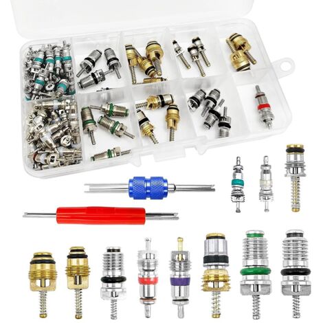 Progrès-noyau de valve AC de voiture Noyau de Valve de Climatisation Kit d'outils de démontage de noyau de valve de climatisation R134A de... Réfrigérant R12 R134a 102pcs Car R12 & R134a A/C Air Conditioner Valve Core Remover Tool Kit Accessoires Climatisation Automobile Il est bien équipé et pratique. Merci de votre compréhension. 1 ensemble de kit de noyau de valve de climatisation de voiture outils... Il est idéal pour les mécaniciens et les ateliers de réparation de climatisation. 【Composant Clé】: Noyau de Valve Climatisation Voiture pour R12 et R134a, idéal pour les accessoires de climatisation automobile. 【Compatibilité Technique】: Type haute et basse pression adapté à la plupart des voitures fonctionnant avec 134A / R12., 【Applications Professionnelles】: Idéal pour les mécaniciens et les ateliers de réparation A/C, ce kit inclut 99% des valves. 【Contenu du Kit】: Ce Kit d'Outils de Réparation Climatisation Conditionnement d'Air Soupape comprend 102 pièces, dont 100 noyaux de valve et 2 outils de retrait, bien équipé et pratique.