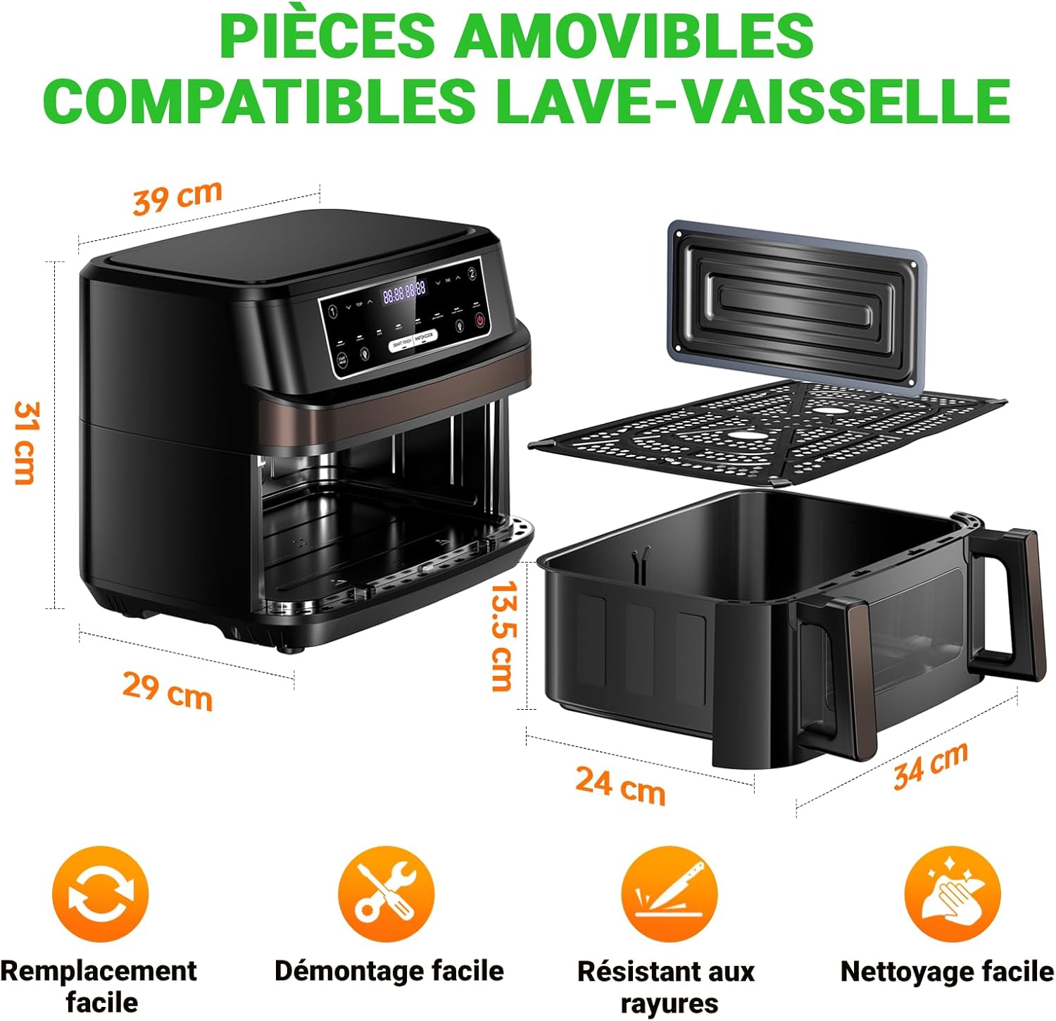 Friteuse Sans Huile Double Air Fryer STANEW,Dual Zone Avec Fenêtre De Visualisation, Friteuse Sans Huile 9L, 8 Programmes De Cuisson, Écran Tactile,Alerte Aux Tremblements,Noir Air Fryer 2 Compartiments Friteuse sans huile Airfryer MOULINEX EZ855AF0 à 59,99 EDION Air Fryer P20 XXL Double Copartient (Fonction dual cook & sync finish, fenêtre visible... Idéale pour préparer plusieurs recettes en une seule fois. ✅ 8 PROGRAMMES PRÉRÉGLÉS : Cette air fryer sans huile double zone polyvalente propose 8 programmes prédéfinis. Que vous souhaitiez un poulet rôti croustillant ou des frites dorées et croustillantes, il suffit d'appuyer sur un bouton pour profiter de votre repas. ✅ CAPACITÉ DE 10 L, DEUX PANIERS : Cette friteuse air fryer spacieuse de 10 litres est équipée de deux paniers de 5 litres, vous permettant de cuisiner différents plats simultanément sans mélange d'odeurs. La protection intégrée contre la surchauffe coupe l'alimentation si la température dépasse les limites. Pour plus de sécurité. Préparez ainsi des plats croustillants et faibles en matières grasses en un clin d'œil. Design Double Unique avec 2 Compartiments Indépendants:Avec son air fryer double compartiment de 2 x 5L, préparez deux plats simultanément sans transfert d’odeurs ! Cette friteuse électrique haute performance maximise l’efficacité et la capacité, parfaite pour les familles ou pour cuisiner un repas complet en une seule fois