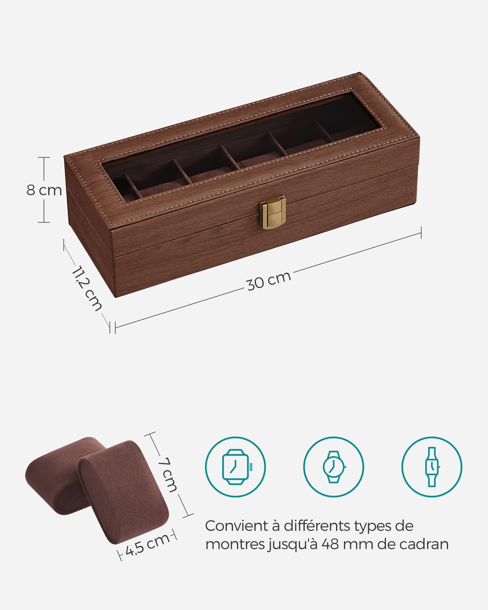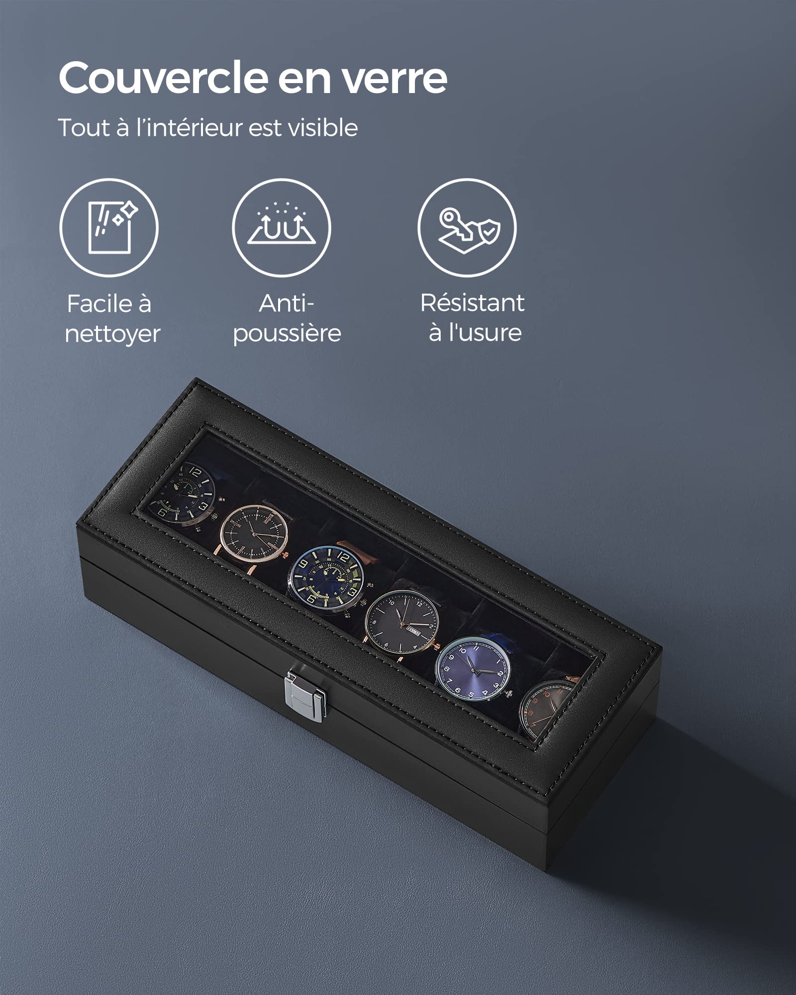 Précautions de SONGMICS : Gardez cette boîte à montres à l’abri de l’humidité. N’exposez pas cet étui à montres à la lumière directe du soleil afin d’éviter toute décoloration. Pourquoi choisir cet étui de voyage pour 2 montres ? Parfait pour voyager : Petit, léger et facile à glisser dans vos bagages pour tous vos déplacements. Ne laissez aucun objet pointu entrer en contact avec cet étui pour montre, au risque d’abîmer sa surface. Idée cadeau : Cette boîte à montres pratique ne manquera pas d’impressionner les globe-trotteurs ou les passionnés d’horlogerie. Sa doublure en velours protège délicatement vos montres Fermeture sécurisée : Bouton-pression qui garde vos montres en sécurité pendant vos déplacements. Design classique : Extérieur élégant qui apporte une touche raffinée. SONGICS UJOW008K01 Boîte à ontres à 8 eplaceents avec grand... Prêt pour le voyage : Mesurant 10,1 x 12 x 8,5 cm, ce coffret pour montre à 2 emplacements est idéal pour voyager, vous permettant d’emporter vos montres préférées partout N’utilisez pas d’eau ni de produits chimiques pour nettoyer cette boîte à montres. Plus de détails raffinés MengH-SHOP Boîte à Montres 2 Emplacements Boîte de Rangement pour Montres PU Écrin à Montres avec Couvercle en Verre Organisateur pour Montres et Bijoux Caractéristiques : Couleur : Surface noir d'encre, doublure gris tourterelle Séparation protectrice : Le séparateur maintient vos montres bien à l’écart l’une de l’autre. Poche pour accessoires : Poche à rabat pour garder vos petits essentiels en sécurité. Design classique, intérieur doux : Cet étui pour montre présente un extérieur élégant, fermé par un bouton-pression au style intemporel. Livraison : 1 x Boîte de voyage pour montres Gourde fonctionnelle de sport avec compartiment secret pour cacher... Coffret Montre 2 Places Velours Étui De Voyage Pour Montres, 2 Emplacements, Avec Compartiment Secret Poche Separateur Ajustable 101 X 12 X 85 Cm Idee Cadeau Surface Noir Dencre Doublure Gris Tourterelle 90114377 Bijoux Homme Dimensions : 10,1 x 12 x 8,5 cm (P x L x H), Poids : 200 g Rangement astucieux : Le coussin est doté d’un séparateur réglable pour accueillir 2 montres de tailles différentes. Adaptabilité totale : Séparateur réglable permettant d’accueillir des montres de différentes tailles.