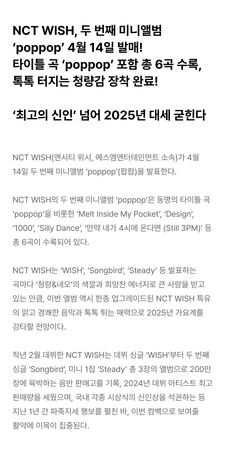 Achetez NCT WISH [POPPOP] 2nd Mini Album (PHOTO BOOK Ver. Card) au meilleur prix. Livraison gratuite (voir cond.). Découvrez toutes les promotions CD & Vinyles, les nouveautés ainsi que les titres en précommande (KPOP MARKET Store Gift) from Korea, Republic of 100% Original Brand New Item Will be Count Towards Hanteo and Gaon Chart (Family Code : HF0082LES001), From South Korea. 100% Original Brand New Item. Jewel Case NCT WISH 2nd Mini Album - Poppop ( Ver.) – Choice Music LA Album Inclus Poster Photocards Please take an UN-BOXING video right after the delivery arrived in case of any defective or missing items inside., Release Date : 2025., 04., 15 CD + 96p Photobook + Folded Poster + Pop-up Card + Photocard Pre-Order Gift (Photocard) is Not Included. NCT WISH (NCT Wish) filled its second mini-album pop pop with a refreshing love song.The album Outer case is to only protect inclusions inside therefore out box damages cannot be a reason for a RETURN or EXCHANGE. Store Gift : Double-Side Extra Photocards Set