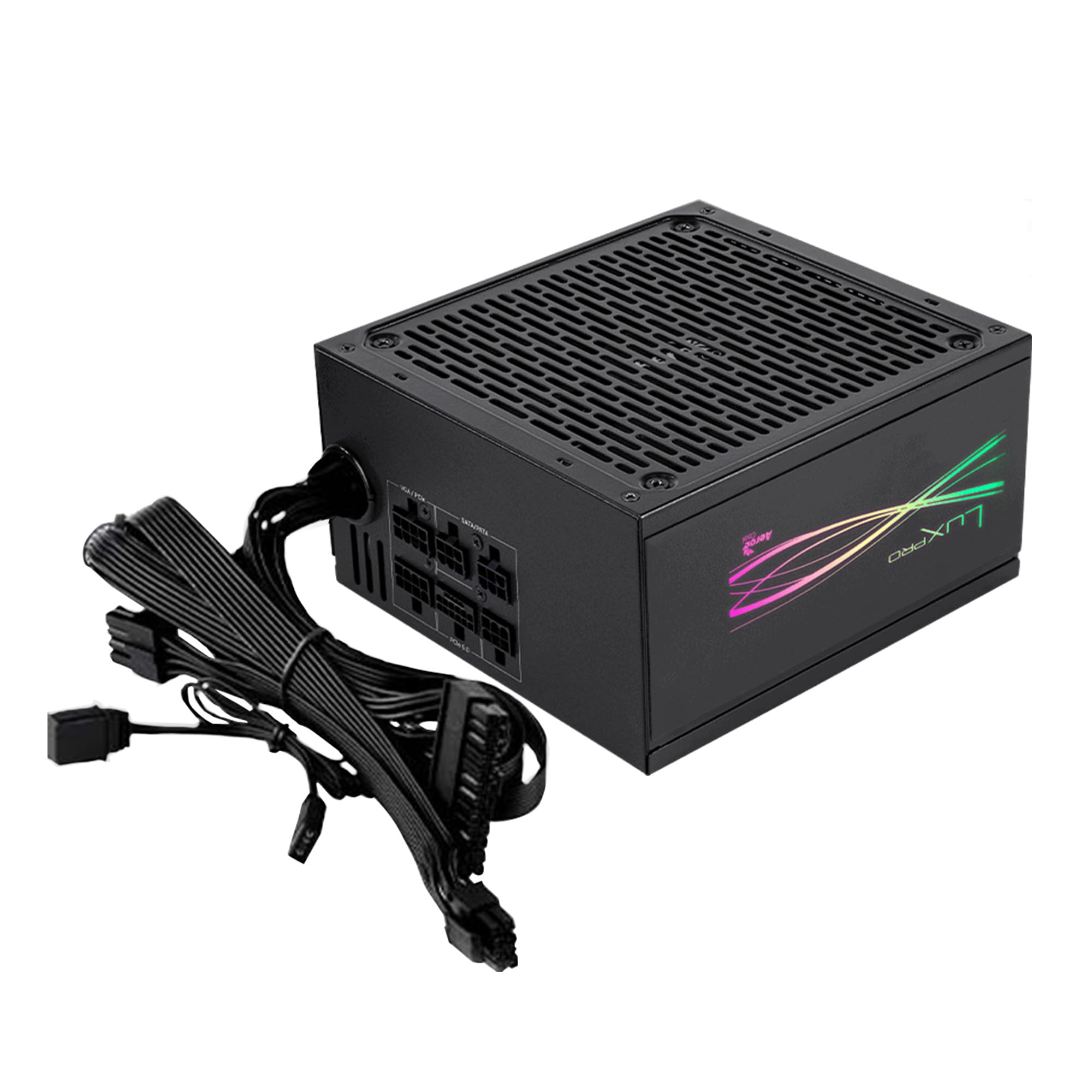 Aerocool LUX850, Power Supply 850W, 80 Plus Bronze Test MarbleBron RGB 850W White d'Enermax, 850 Watts en 80Plus Bronze... Alimentation 80Plus Bronze ATX 3.0 Aerocool LUX850, Alimentation Pour PC 850W, 80Plus Bronze 230V 88% Efficace, APFC Ventilateur Fdb 14cm Certifiée 80Plus Bronze 230V EU, l'alimentation LUX PRO RGB 850M assure un rendement de plus de 88%. Dans cette nouvelle édition, le LUX PRO est renouvelé avec l'ajout de condensateurs japonais 105° et d'un ventilateur FDB de 14 cm pour une meilleure circulation de l'air et une plus grande durabilité du système. Aerocool MIRAGEGOLD750, Alimentation pour PC 750W, RGB Infinity Mirror... Sa conception semi-modulaire intelligente simplifie l'installation et optimise la gestion des câbles. Il bénéficie également d'une garantie de 5 ans., ATX3., 0 avec support GPU PCIe5., 0., Connecteur 12VHPWR pour une intégration transparente avec les cartes graphiques haut de gamme. ÉCLAIRAGE LED RGB : Découvrez un éclairage vibrant et dynamique grâce au design LED Vivid Prism RGB de l'alimentation LUX PRO RGB et personnalisez votre espace avec jusqu'à 13 effets d'éclairage ; gérez-les facilement via un interrupteur de contrôle LED ou synchronisez-les avec des cartes mères ARGB compatibles pour une expérience d'éclairage personnalisée INTÉGRATION DE DERNIÈRE GÉNÉRATION : LUX PRO RGB 850M est dotée de la technologie ATX3., 0, qui améliore l'efficacité énergétique et la stabilité du système, et intègre un support GPU PCIe5., 0 complet et un connecteur 12VHPWR, garantissant une compatibilité totale avec les cartes graphiques haut de gamme ; elle comprend également des condensateurs japonais à 105°C et une garantie étendue de 5 ans
