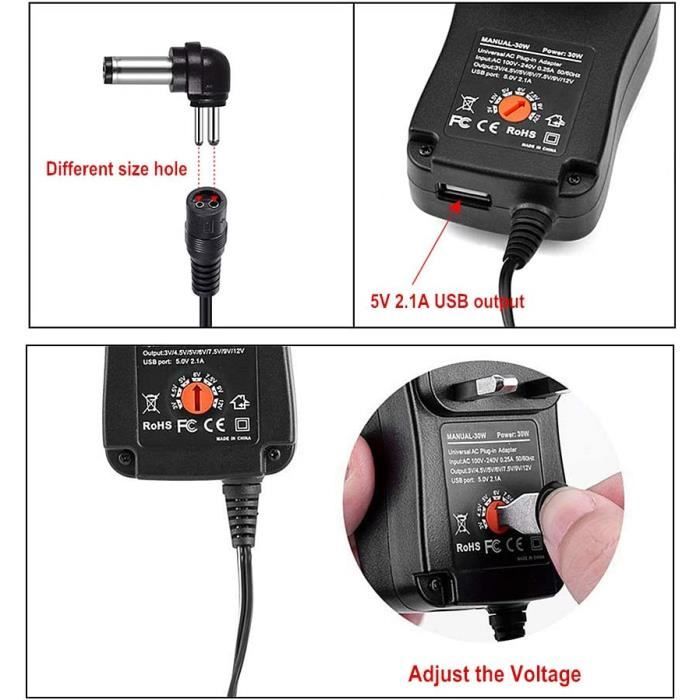 Asdr Adaptateur d'alimentation avec 6 fiches 12V 12W 1.2A, réglable et La fonction de protection contre la polarité garantit une utilisation sécurisée. Adaptateur Universel Réglable 3V à 12V 12W Alimentation Universelle Réglable 3V-12V 2A Adaptateur électronique Polyvalent Le sélecteur de tension rotatif permet un ajustement facile et précis. Il mesure seulement 6,5x4x4cm, donc il prend presque pas de place. Compatible avec plein d'appareils : éclairage LED, routeurs, petits appareils électroménagers... 3V-12V Adaptateur D'Alimentation Universel Réglable 12W - 30W Avec... POLYVALENCE: 6 embouts interchangeables différents pour une compatibilité avec une large gamme d'appareils électroniques (2., 5*0., 7mm /3., 0 1., 1mm/3., 5*1., 35mm /4., 0*1., 7mm /5., 0*2., 1mm /5., 5*2., 5mm) Idéal pour alimenter divers appareils domestiques comme les routeurs, LED, caméras et autres périphériques électroniques. SÉLECTEUR DE TENSION: Bouton rotatif pratique pour ajuster facilement la tension de sortie selon vos besoins Le set comprend 6 embouts interchangeables compatibles avec de nombreux appareils électroniques. Un accessoire indispensable pour votre maison ou votre bureau, combinant praticité et fiabilité. Doté d'une tension réglable de 3V à 12V et d'une intensité maximale de 1,2A, cet adaptateur s'adapte parfaitement à vos besoins variés.