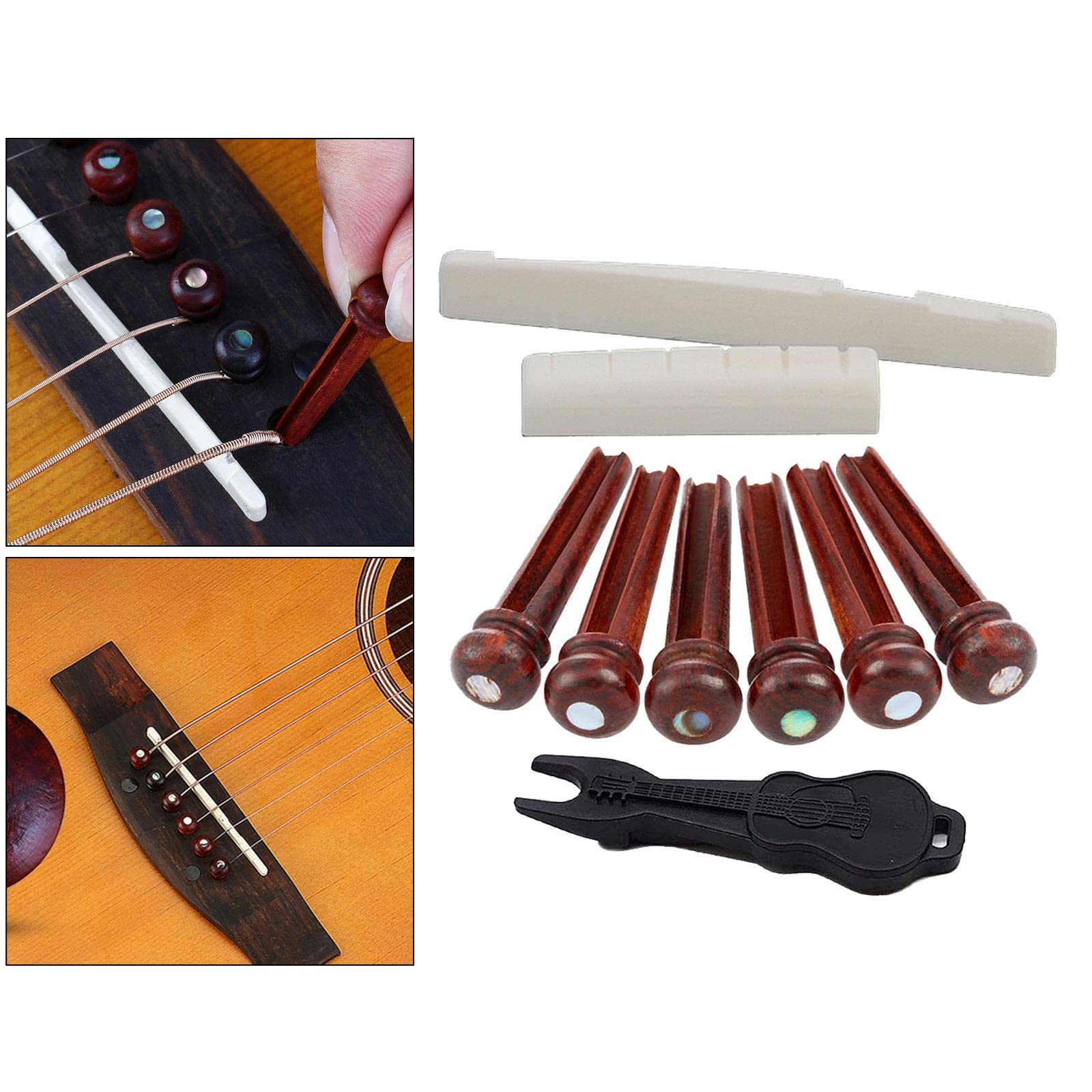 Goupilles Pont Guitare Pont De Guitare En Alliage De Zinc D'or Pour La Guitare De B En Ance Set Selle écrou Extracteur GES - Jeu d'écrous de selle de goupilles de pont Bridge Pins Saddle Nut... Goupilles De Pont De Guitare, écrou De Selle Pour Accessoires [Compatibilité universelle] Conçu pour s'adapter à la plupart des guitares acoustiques à 6 cordes, cet ensemble est parfait pour remplacer les pièces anciennes ou usées des guitares folk et acoustiques, offrant un ajustement parfait et sécurisé. Goupilles De Pont En Guitare Acoustique Et Selle, Foyer Choisi Photo... [Ensemble de broches de chevalet de guitare acoustique] Cet ensemble est livré avec 6 broches de guitare, 1 selle, 1 écrou, 1 extracteur de broches de guitare, 2 médiators de guitare [Taille] L'écrou de guitare mesure 43 mm et le chevalet mesure 72 mm, assurant un ajustement précis pour les guitares acoustiques à 6 cordes (veuillez confirmer la taille appropriée avant d'acheter) [Outil d'extraction de goupilles pratique] L'extracteur de goupilles inclus facilite le retrait des goupilles de chevalet sans endommager votre guitare, ce qui permet d'économiser du temps et des efforts lors des changements de cordes ou des réparations. Description: Material: Zinc Alloy Size: Nut - 43mm / Saddle - 72mm Color: Sliver Package Included: 6 x Guitar Pin 1 x Saddle 1 x Nut 1 x Guitar Pins Puller 2 x Guitar Picks